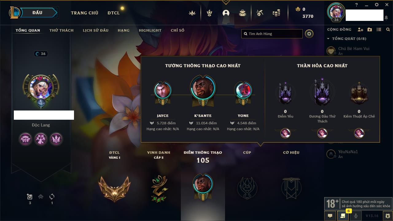 Rank Đơn: Chưa rank mùa nàoKhung: Chưa có khungTướng: 8 - Còn 14835 THXTrang Phục: 1Rank ĐTCL: Chưa RankLinh Thú: 7