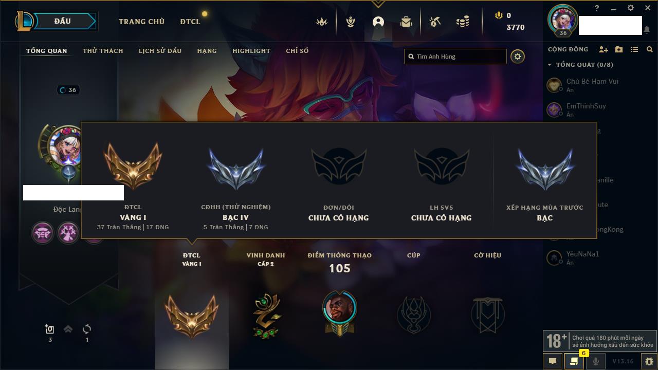 Rank Đơn: Chưa rank mùa nàoKhung: Chưa có khungTướng: 2 - Còn 9000 THXTrang Phục: 0Rank ĐTCL: Bạch Kim IIILinh Thú: 31