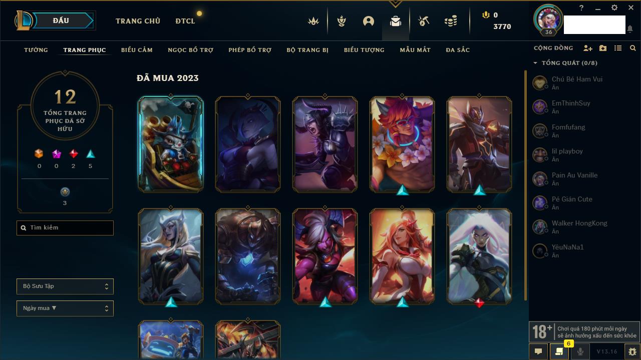 Rank Đơn: Chưa rank mùa nàoKhung: Chưa có khungTướng: 12 - Còn 430 THXTrang Phục: 1Rank ĐTCL: Chưa RankLinh Thú: 1