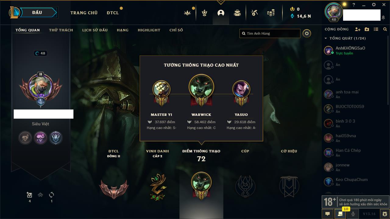 Rank Đơn: Chưa rank mùa nàoKhung: Chưa có khungTướng: 8 - Còn 14835 THXTrang Phục: 1Rank ĐTCL: Chưa RankLinh Thú: 7