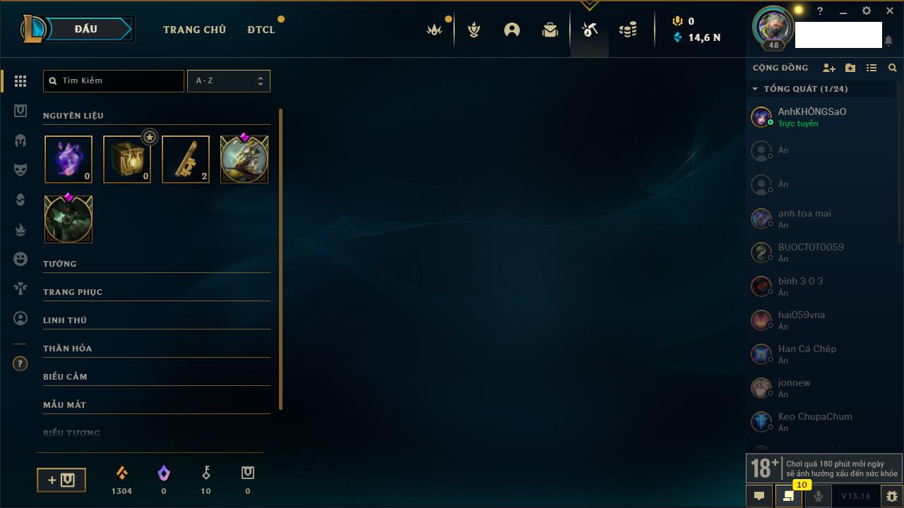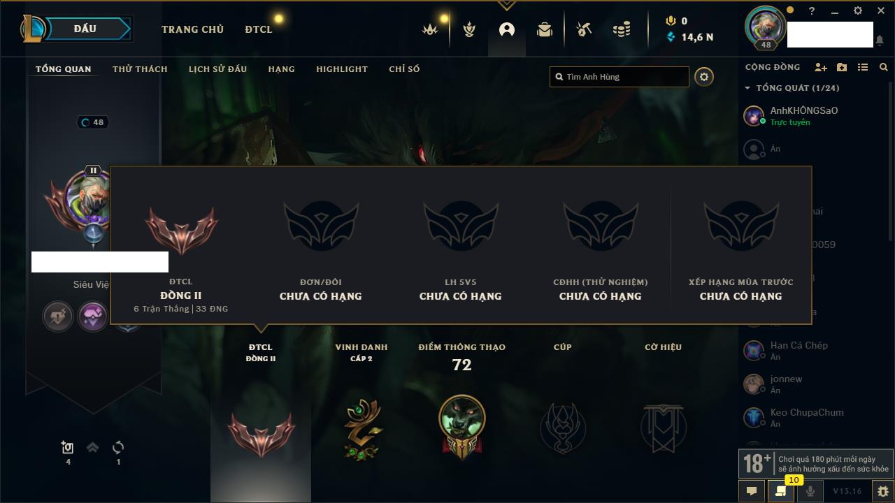 Rank Đơn: Chưa rank mùa nàoKhung: Chưa có khungTướng: 2 - Còn 9000 THXTrang Phục: 0Rank ĐTCL: Bạch Kim IIILinh Thú: 31