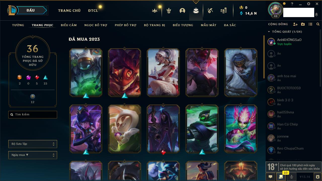 Rank Đơn: Chưa rank mùa nàoKhung: Chưa có khungTướng: 36 - Còn 190 THXTrang Phục: 14Rank ĐTCL: Chưa RankLinh Thú: 65