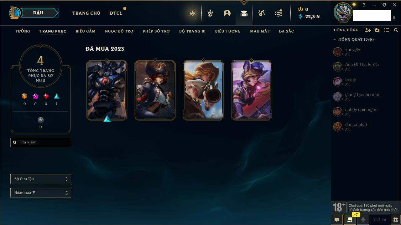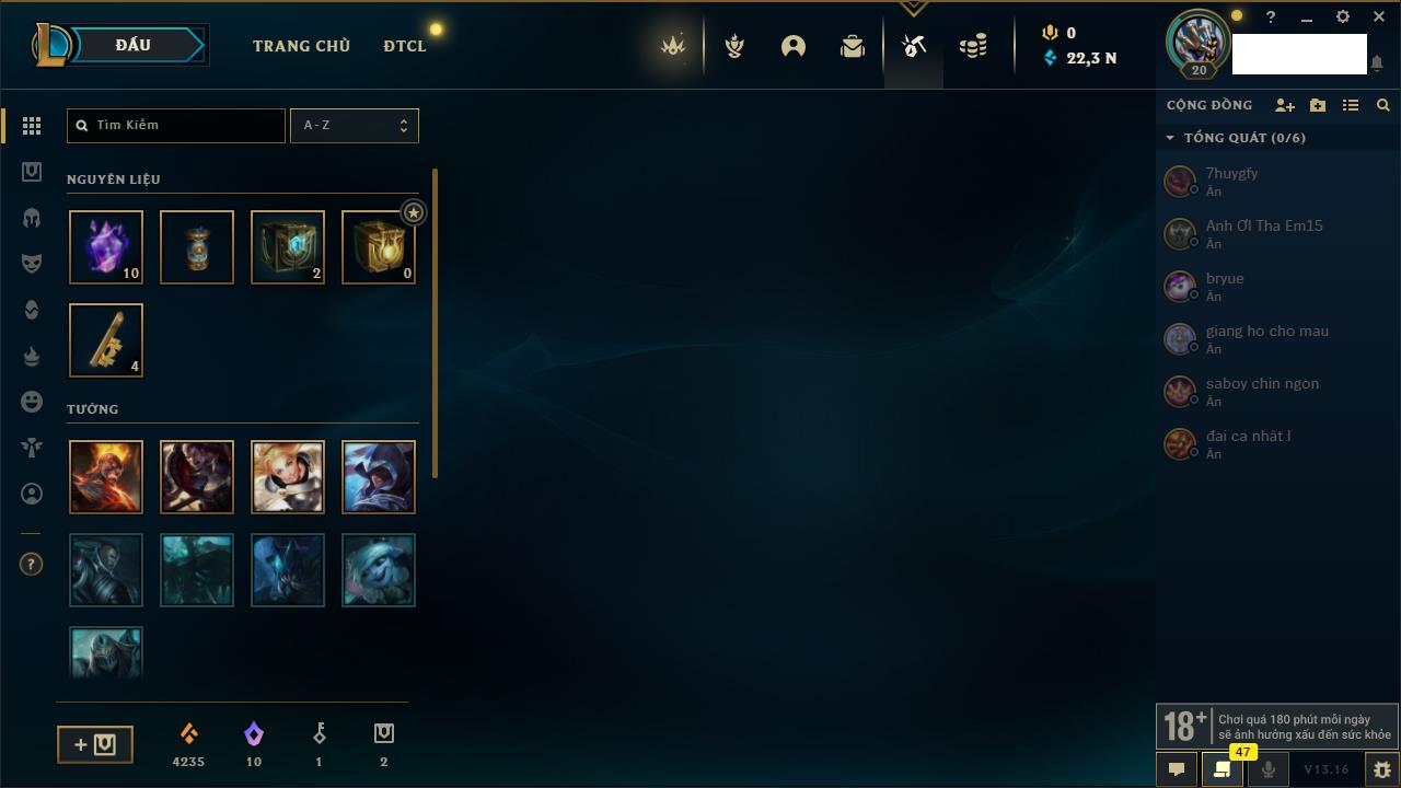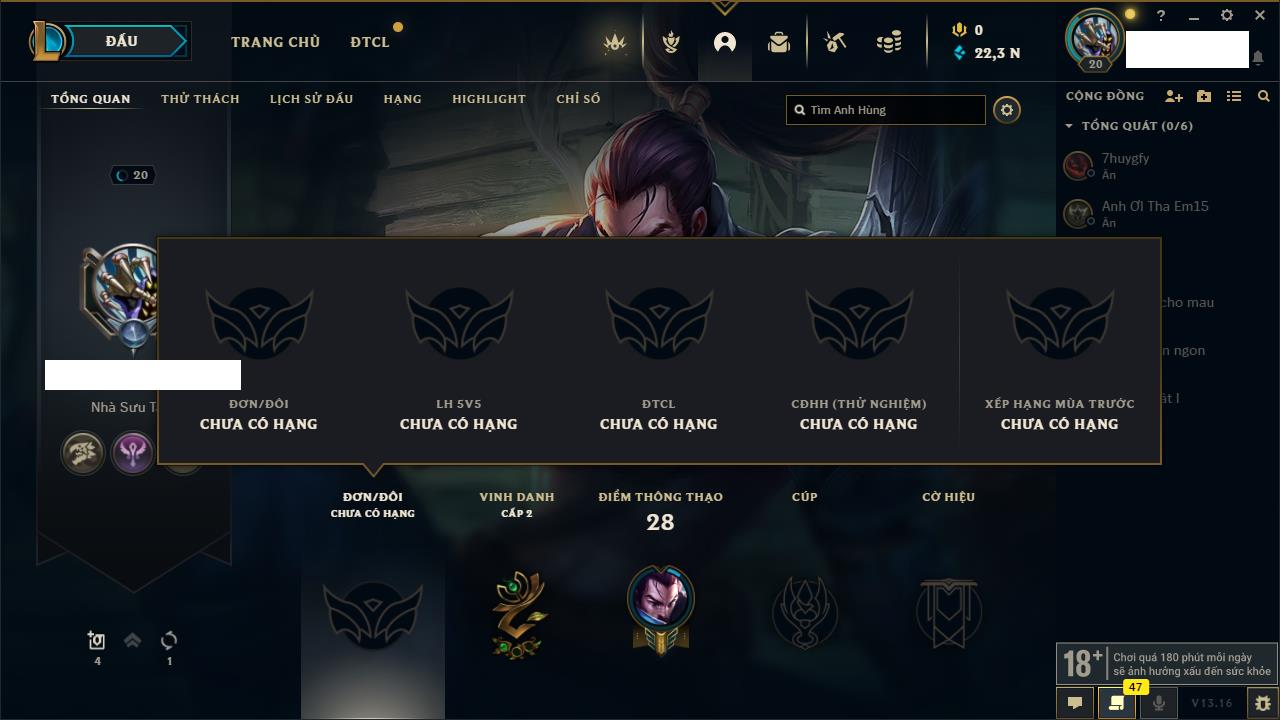 Rank Đơn: Chưa rank mùa nàoKhung: Chưa có khungTướng: 149 - Còn 22310 THXTrang Phục: 4Rank ĐTCL: Chưa RankLinh Thú: 5