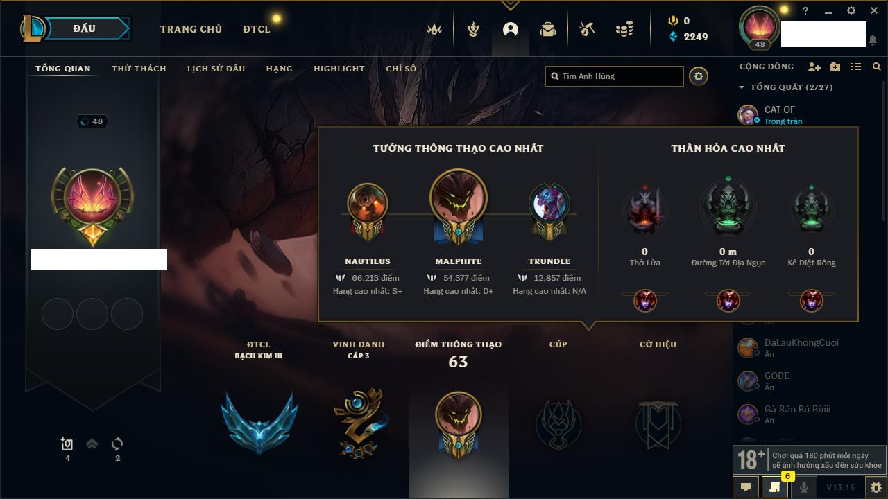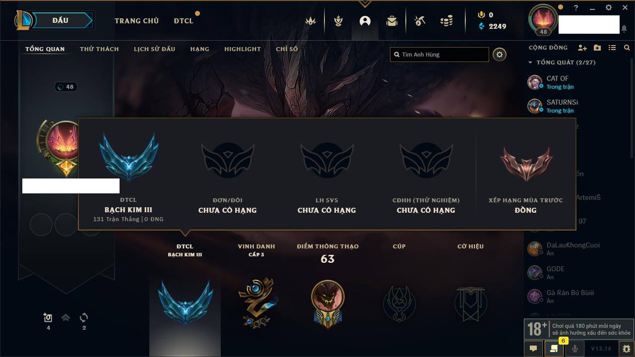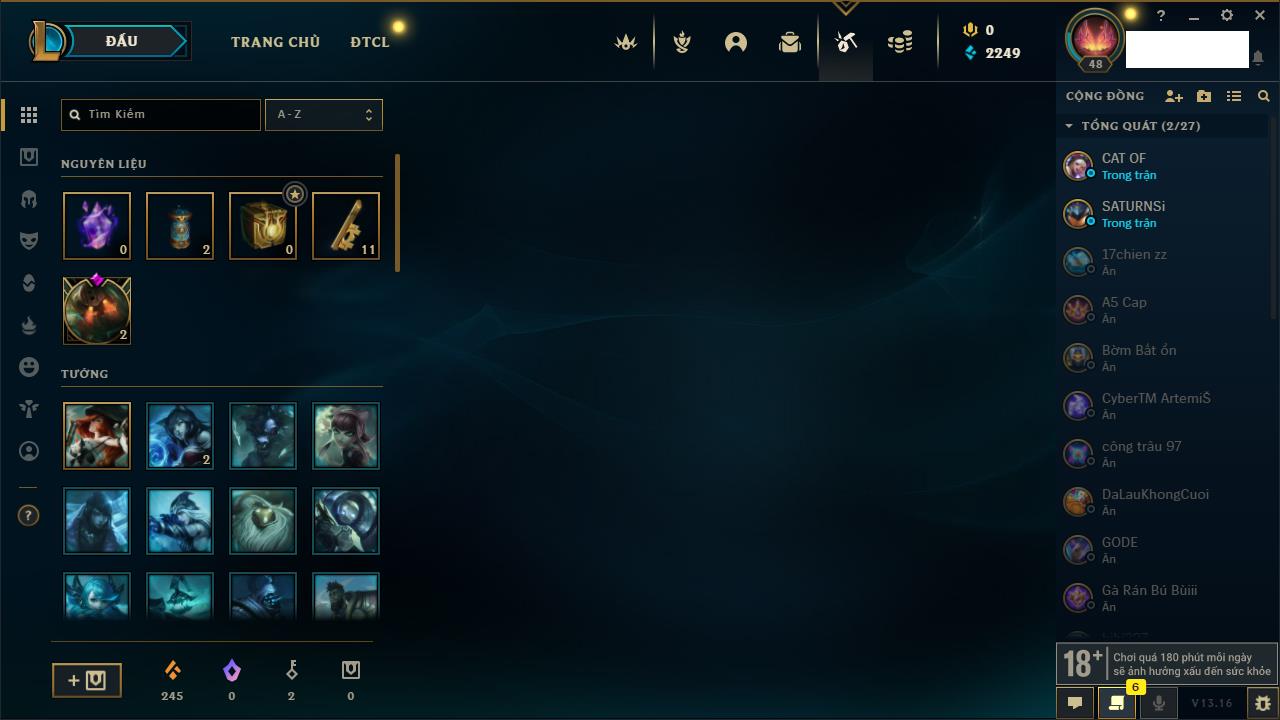 Rank Đơn: Chưa rank mùa nàoKhung: Chưa có khungTướng: 2 - Còn 9000 THXTrang Phục: 0Rank ĐTCL: Bạch Kim IIILinh Thú: 31