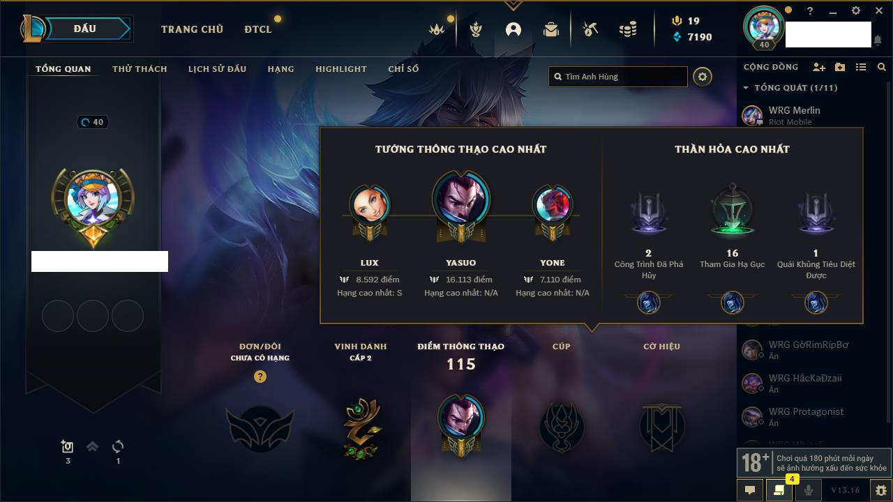 Rank Đơn: Chưa rank mùa nàoKhung: Chưa có khungTướng: 36 - Còn 190 THXTrang Phục: 14Rank ĐTCL: Chưa RankLinh Thú: 65