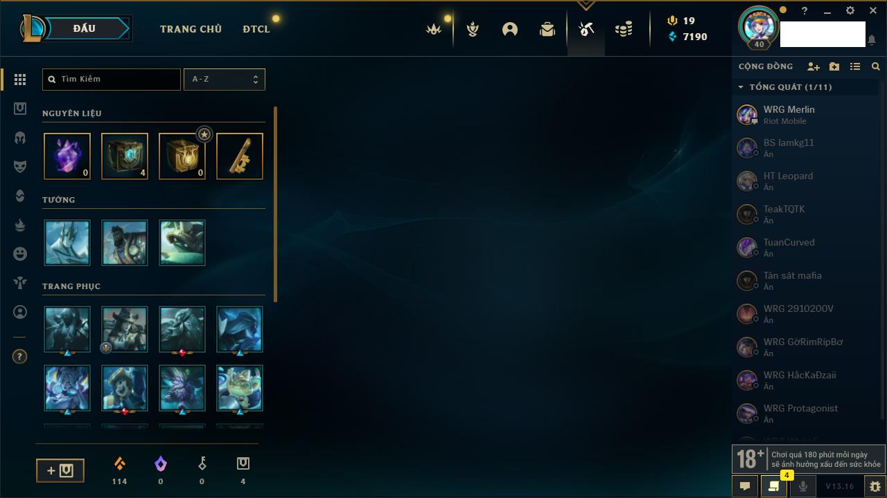 Rank Đơn: Chưa rank mùa nàoKhung: Chưa có khungTướng: 12 - Còn 430 THXTrang Phục: 1Rank ĐTCL: Chưa RankLinh Thú: 1
