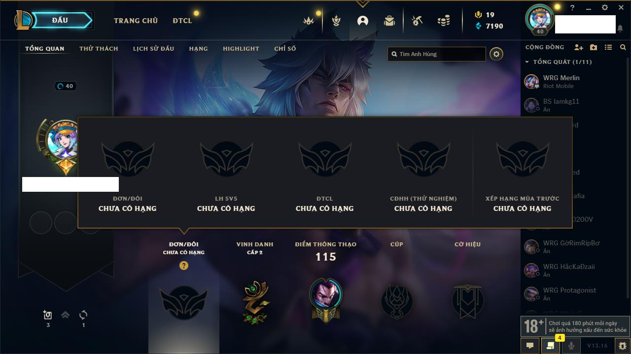 Rank Đơn: Chưa rank mùa nàoKhung: Chưa có khungTướng: 2 - Còn 9000 THXTrang Phục: 0Rank ĐTCL: Bạch Kim IIILinh Thú: 31