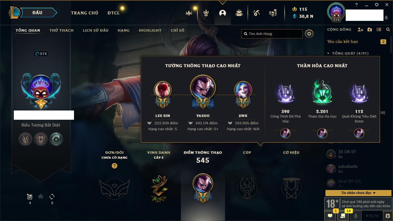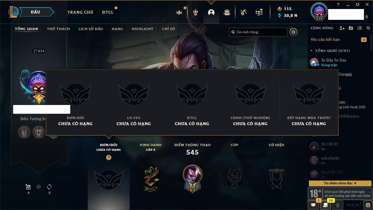 Rank Đơn: Chưa RankKhung: BạcTướng: 141 - Còn 299 THXTrang Phục: 101Rank ĐTCL: Chưa RankLinh Thú: 84