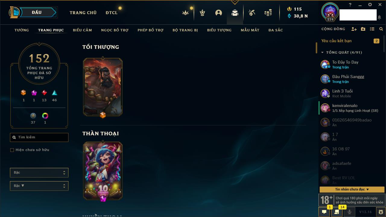Rank Đơn: Chưa RankKhung: Chưa có khungTướng: 163 - Còn 157403 THXTrang Phục: 149Rank ĐTCL: Chưa RankLinh Thú: 122