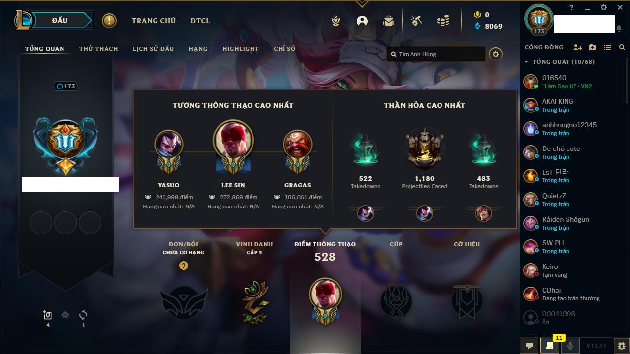 Rank Đơn: Vàng IVKhung: VàngTướng: 171 - Còn 48721 THXTrang Phục: 171Rank ĐTCL: Chưa RankLinh Thú: 27