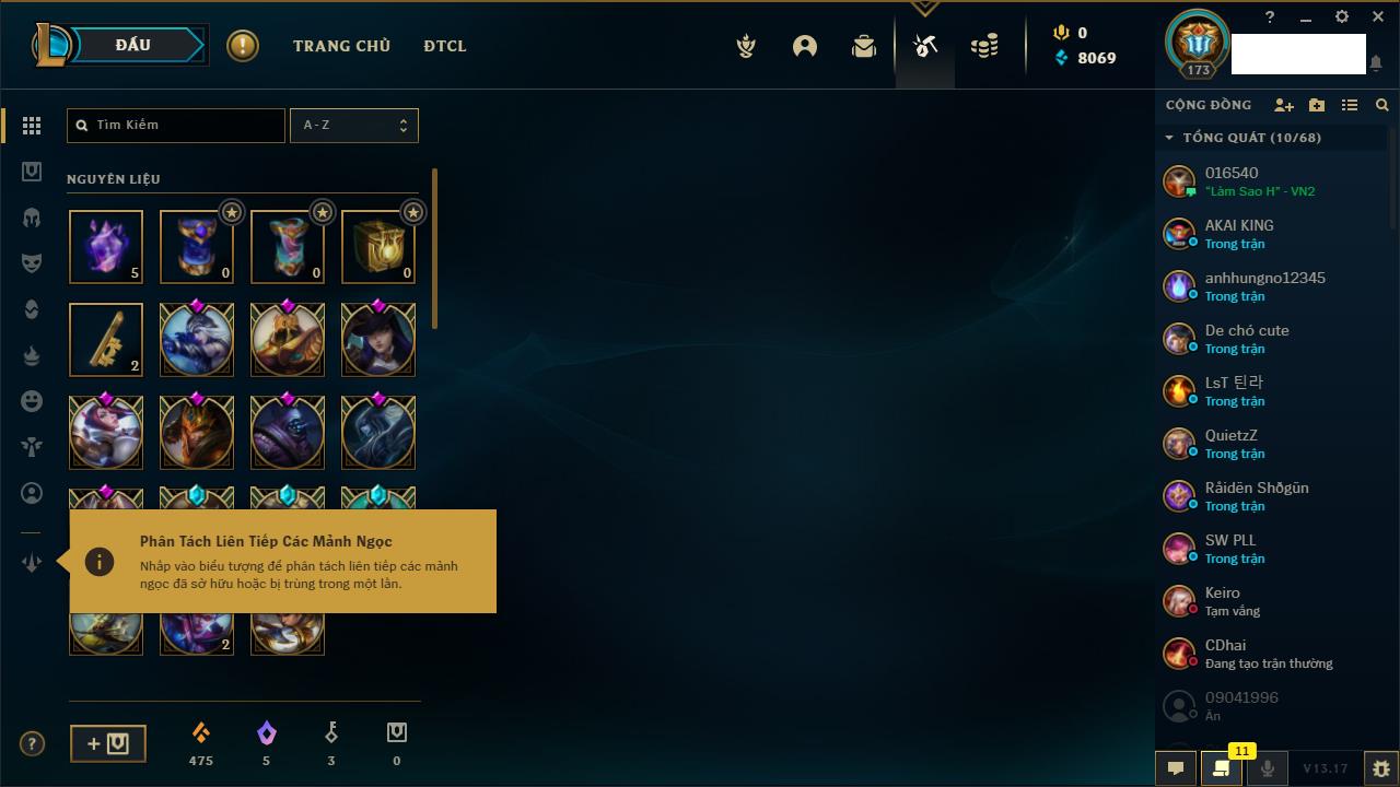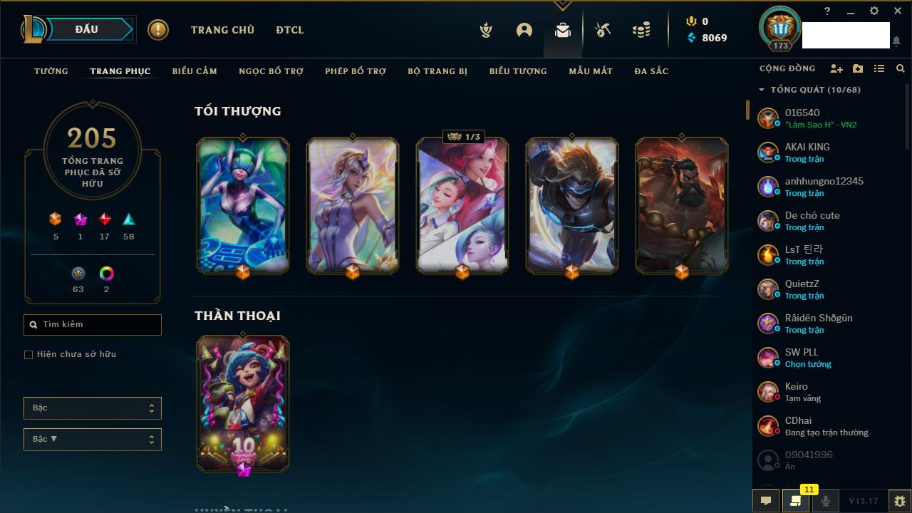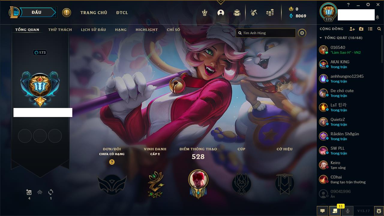 Rank Đơn: Bạc IVKhung: VàngTướng: 172 - Còn 358384 THXTrang Phục: 177Rank ĐTCL: Lục Bảo IILinh Thú: 211