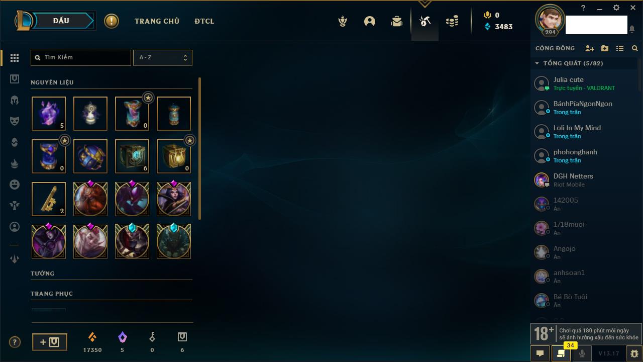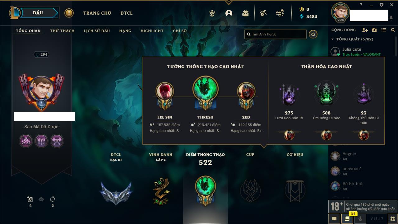 Rank Đơn: Chưa RankKhung: Chưa có khungTướng: 163 - Còn 157403 THXTrang Phục: 149Rank ĐTCL: Chưa RankLinh Thú: 122
