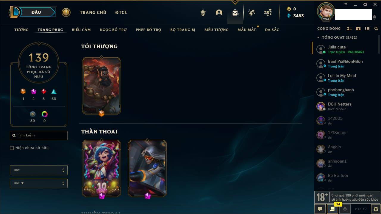 Rank Đơn: Chưa RankKhung: Chưa có khungTướng: 154 - Còn 18477 THXTrang Phục: 127Rank ĐTCL: Vàng ILinh Thú: 183