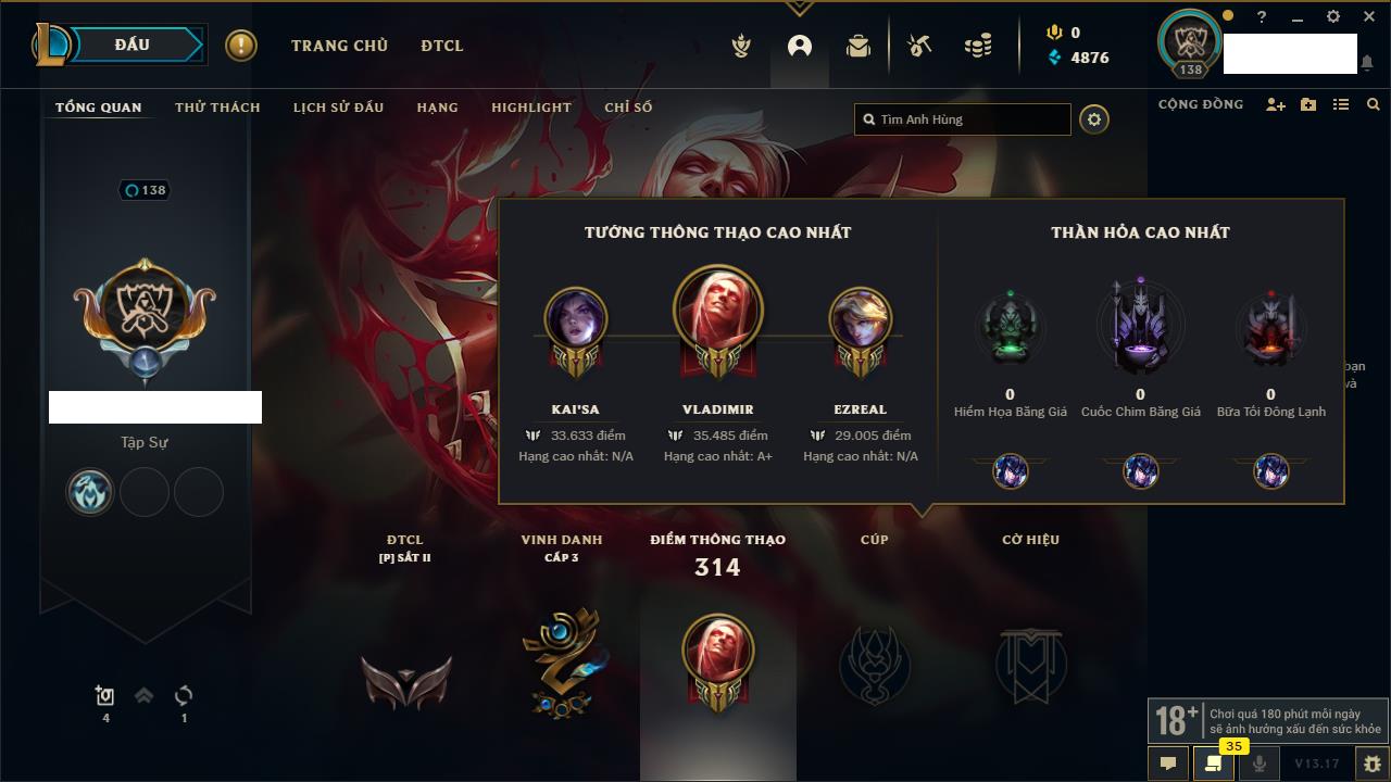 Rank Đơn: Bạch Kim IVKhung: Bạch kimTướng: 151 - Còn 16486 THXTrang Phục: 62Rank ĐTCL: Chưa RankLinh Thú: 12