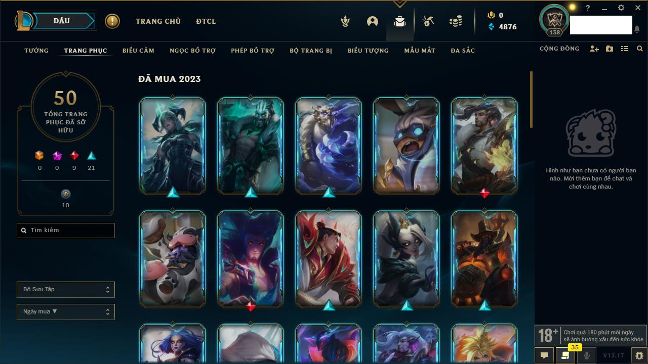 Rank Đơn: Chưa RankKhung: Chưa có khungTướng: 161 - Còn 4964 THXTrang Phục: 151Rank ĐTCL: Chưa RankLinh Thú: 175