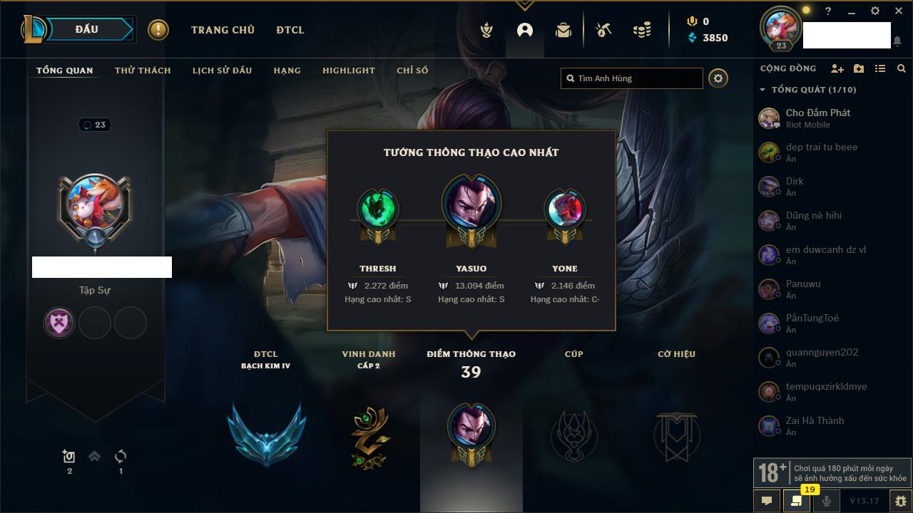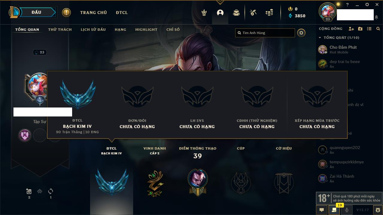 Rank Đơn: Chưa rank mùa nàoKhung: Chưa có khungTướng: 156 - Còn 18550 THXTrang Phục: 4Rank ĐTCL: Chưa RankLinh Thú: 75