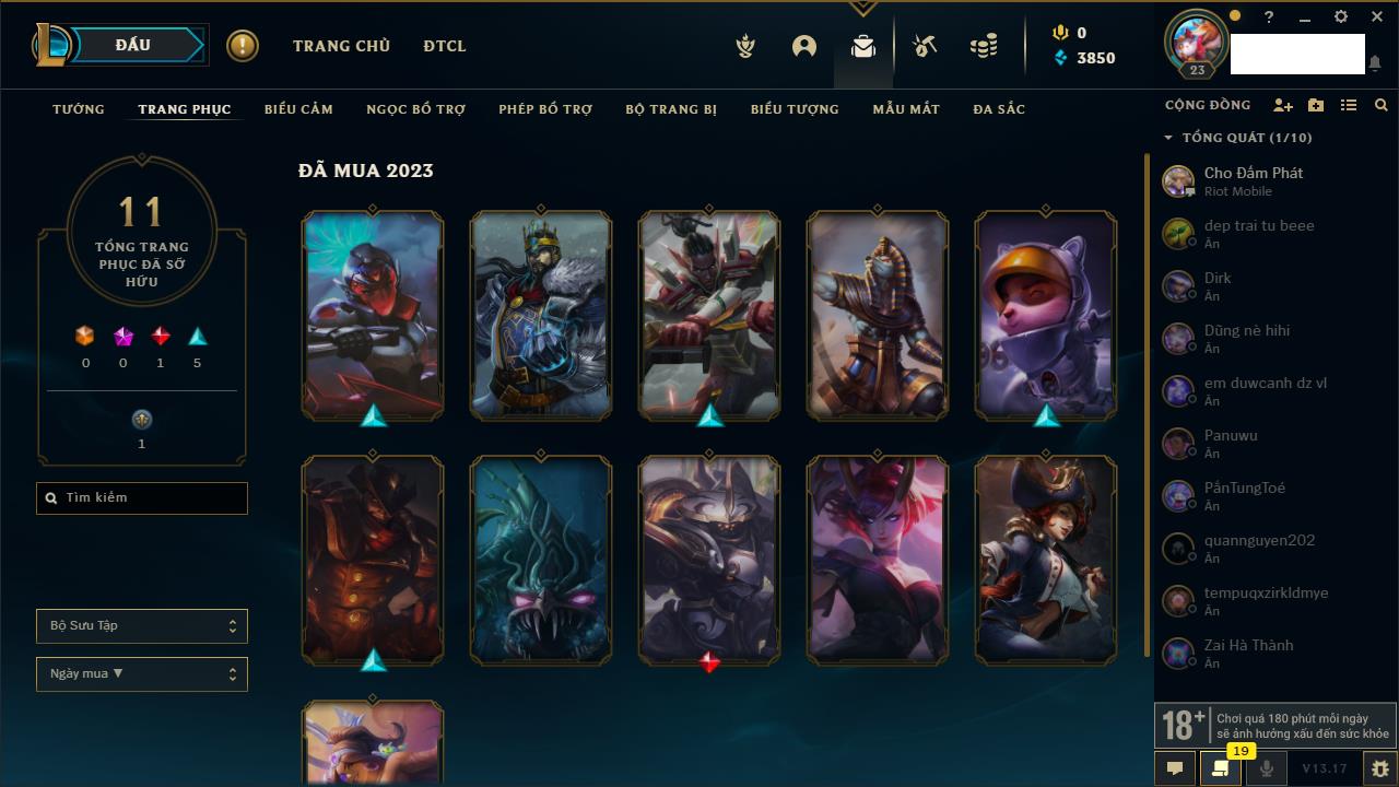 Rank Đơn: Chưa rank mùa nàoKhung: Chưa có khungTướng: 161 - Còn 11380 THXTrang Phục: 13Rank ĐTCL: Chưa RankLinh Thú: 74