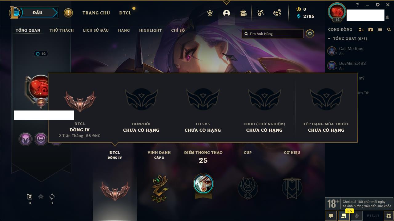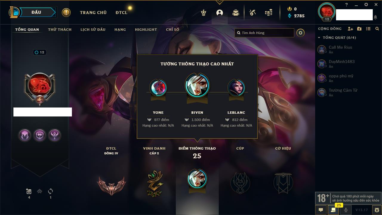 Rank Đơn: Chưa rank mùa nàoKhung: Chưa có khungTướng: 156 - Còn 18550 THXTrang Phục: 4Rank ĐTCL: Chưa RankLinh Thú: 75