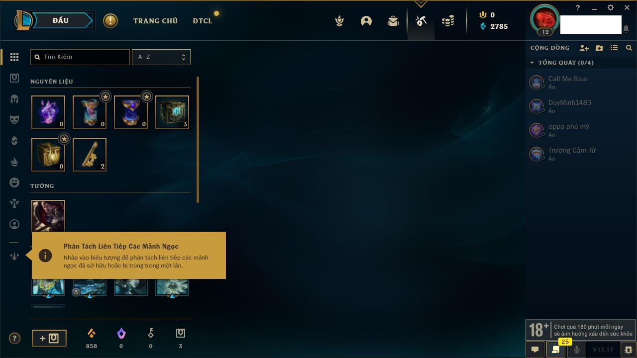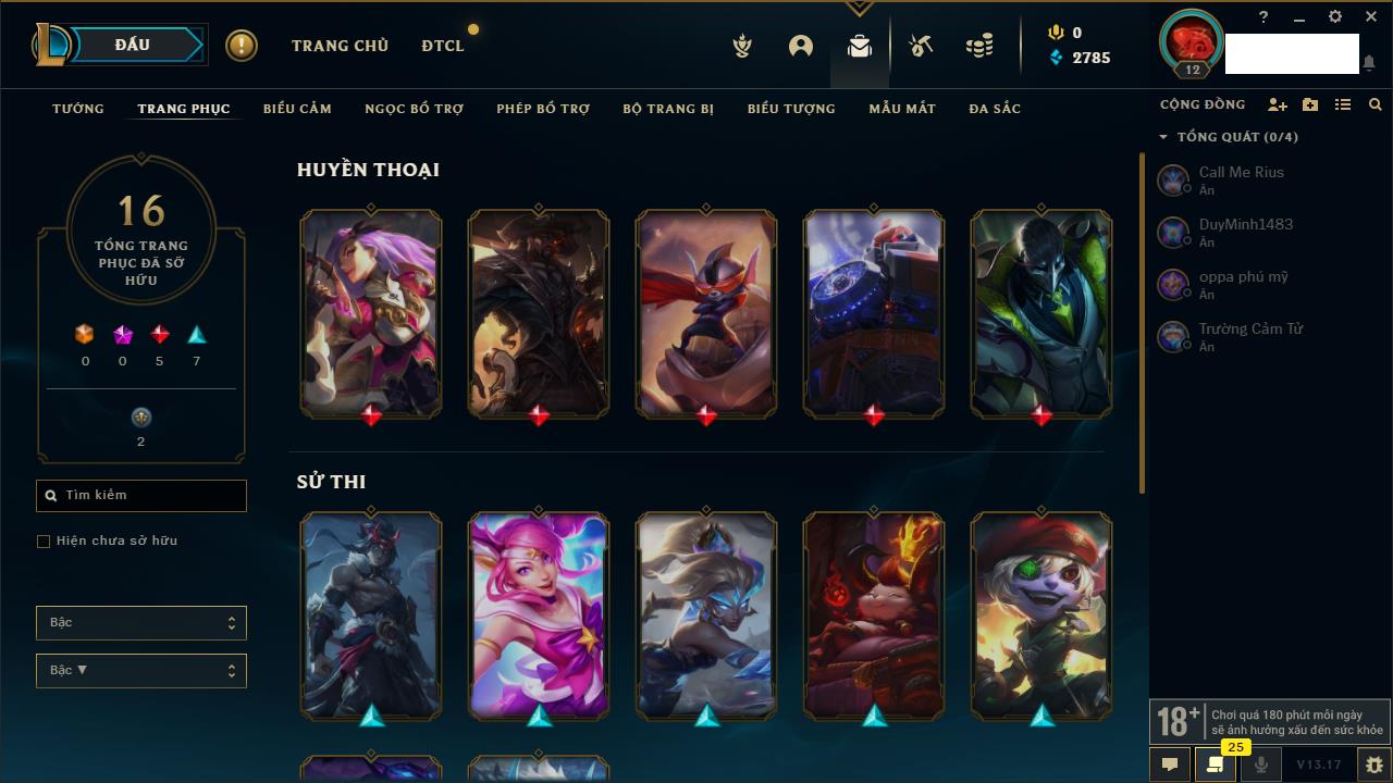 Rank Đơn: Chưa rank mùa nàoKhung: Chưa có khungTướng: 161 - Còn 11380 THXTrang Phục: 13Rank ĐTCL: Chưa RankLinh Thú: 74