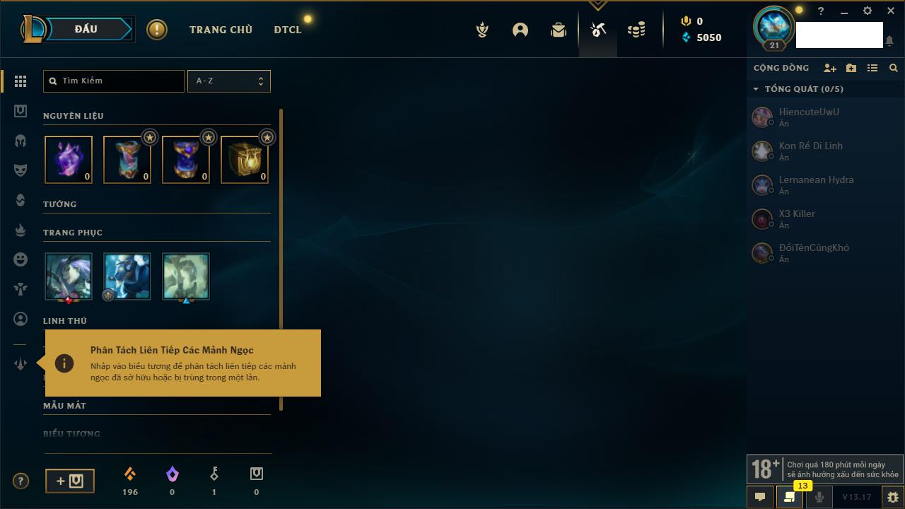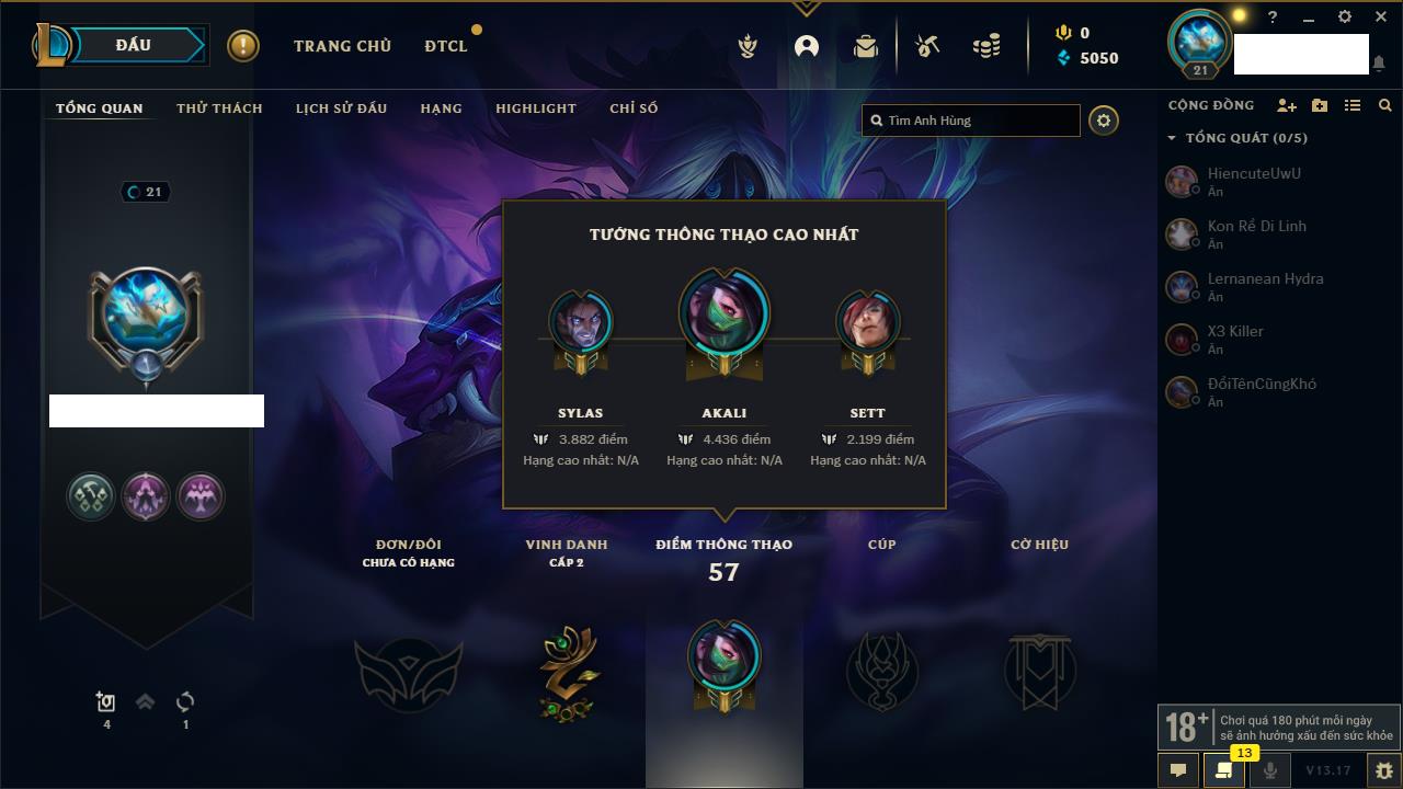 Rank Đơn: Chưa rank mùa nàoKhung: Chưa có khungTướng: 156 - Còn 18550 THXTrang Phục: 4Rank ĐTCL: Chưa RankLinh Thú: 75