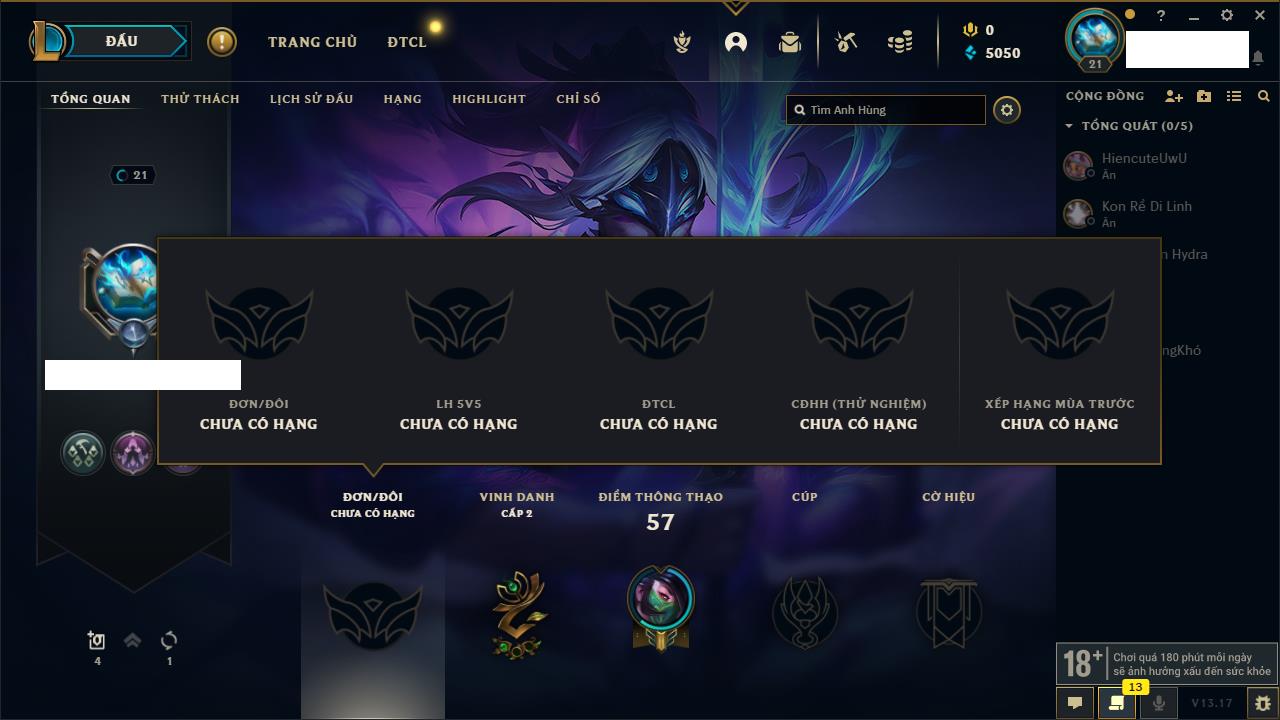 Rank Đơn: Chưa rank mùa nàoKhung: Chưa có khungTướng: 158 - Còn 7805 THXTrang Phục: 5Rank ĐTCL: Chưa RankLinh Thú: 80