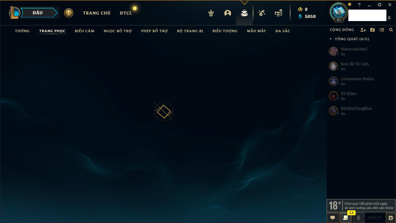 Rank Đơn: Chưa rank mùa nàoKhung: Chưa có khungTướng: 161 - Còn 11380 THXTrang Phục: 13Rank ĐTCL: Chưa RankLinh Thú: 74