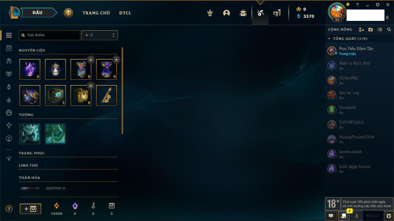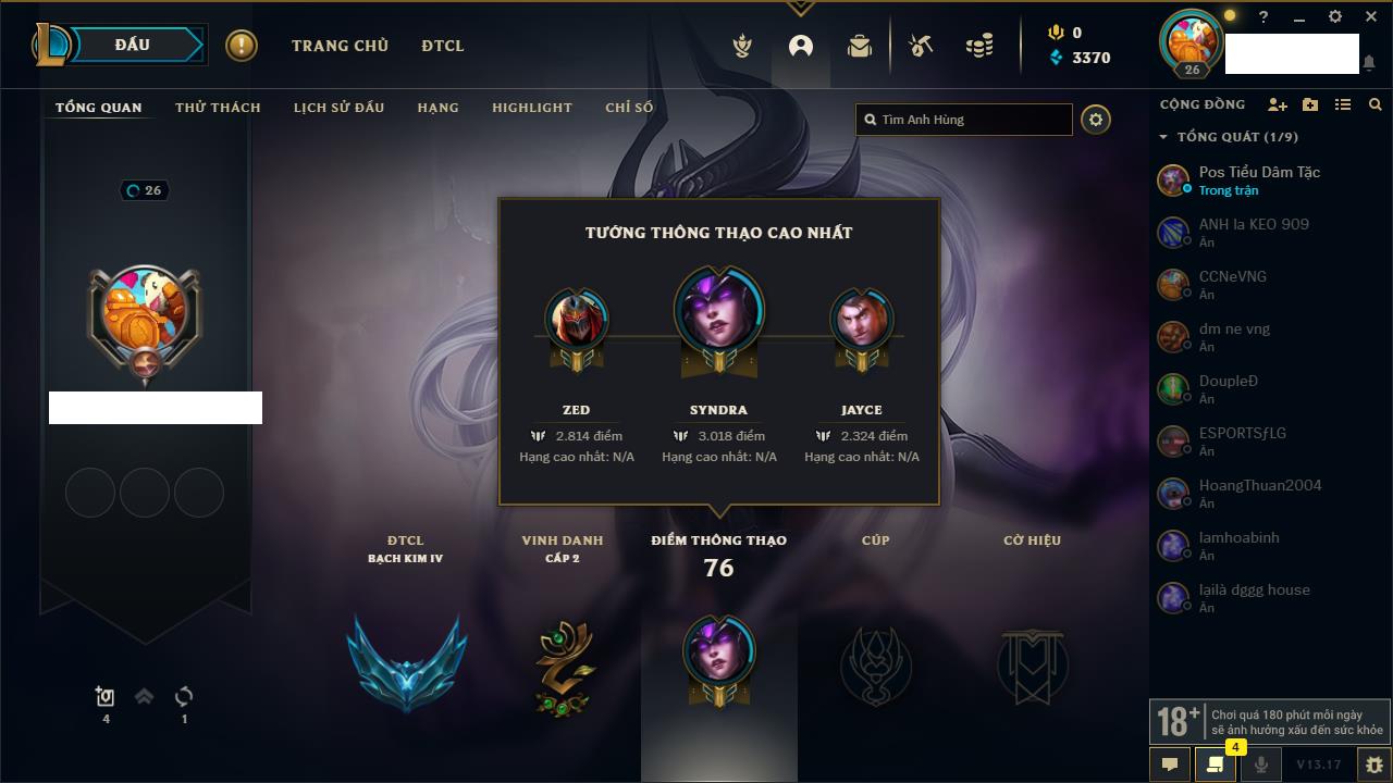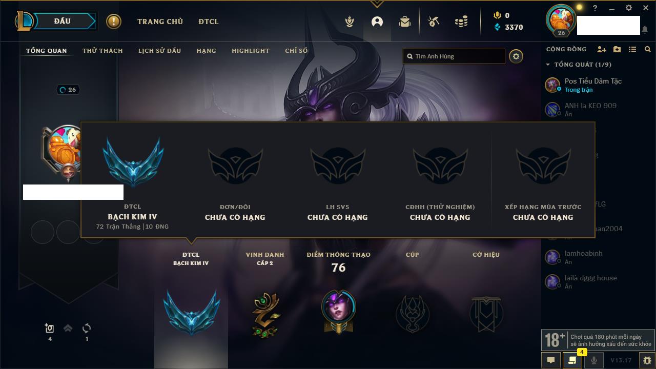 Rank Đơn: Chưa rank mùa nàoKhung: Chưa có khungTướng: 156 - Còn 18550 THXTrang Phục: 4Rank ĐTCL: Chưa RankLinh Thú: 75