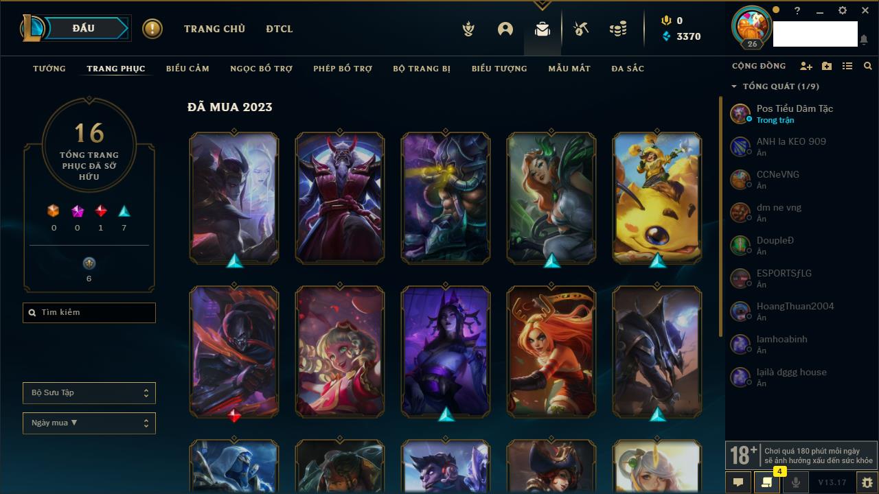 Rank Đơn: Chưa rank mùa nàoKhung: Chưa có khungTướng: 157 - Còn 2079 THXTrang Phục: 11Rank ĐTCL: Chưa RankLinh Thú: 70