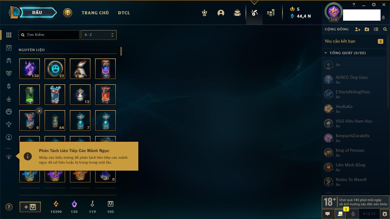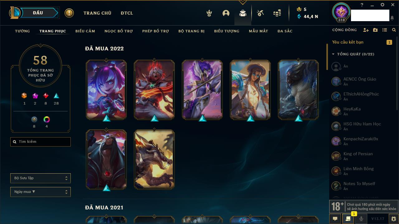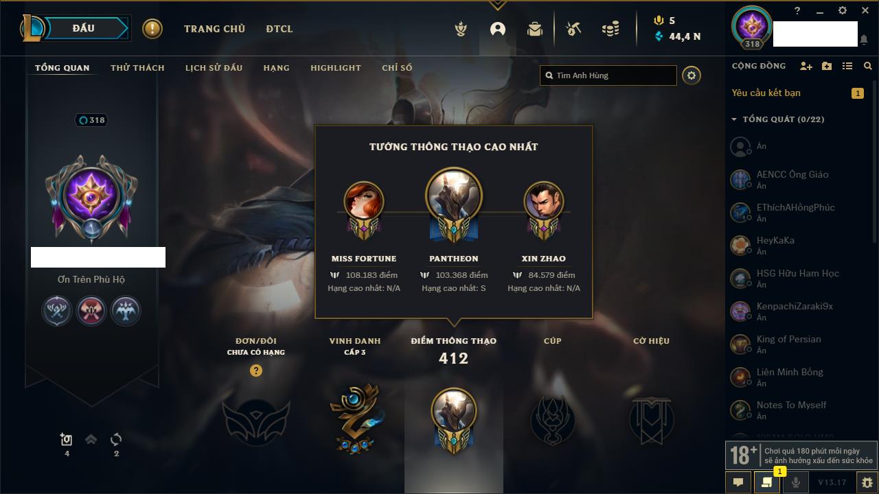 Rank Đơn: Đồng IIKhung: Chưa có khungTướng: 153 - Còn 32832 THXTrang Phục: 66Rank ĐTCL: Chưa RankLinh Thú: 7