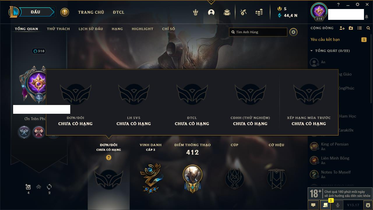 Rank Đơn: Chưa RankKhung: Chưa có khungTướng: 166 - Còn 8843 THXTrang Phục: 120Rank ĐTCL: Chưa RankLinh Thú: 33