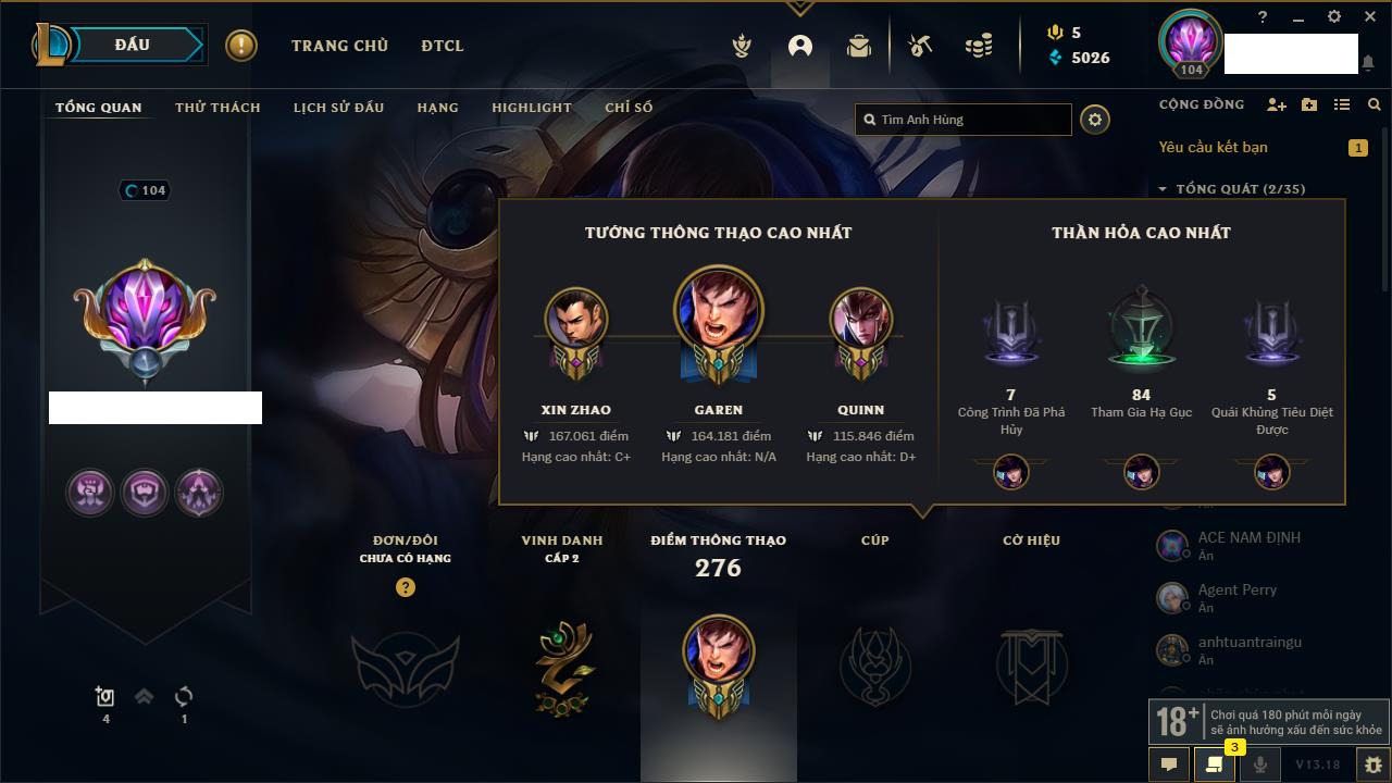 Rank Đơn: Chưa rank mùa nàoKhung: Chưa có khungTướng: 166 - Còn 9615 THXTrang Phục: 26Rank ĐTCL: Chưa RankLinh Thú: 27