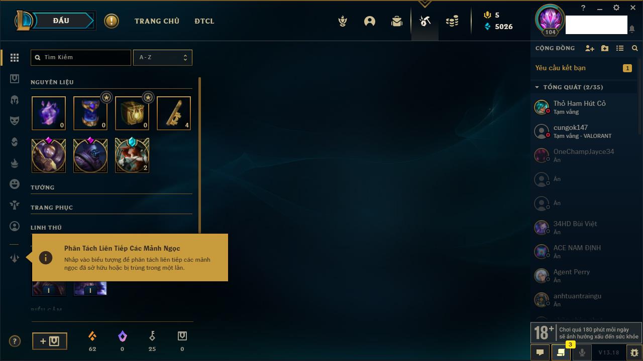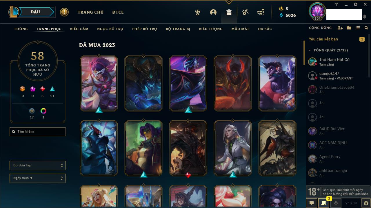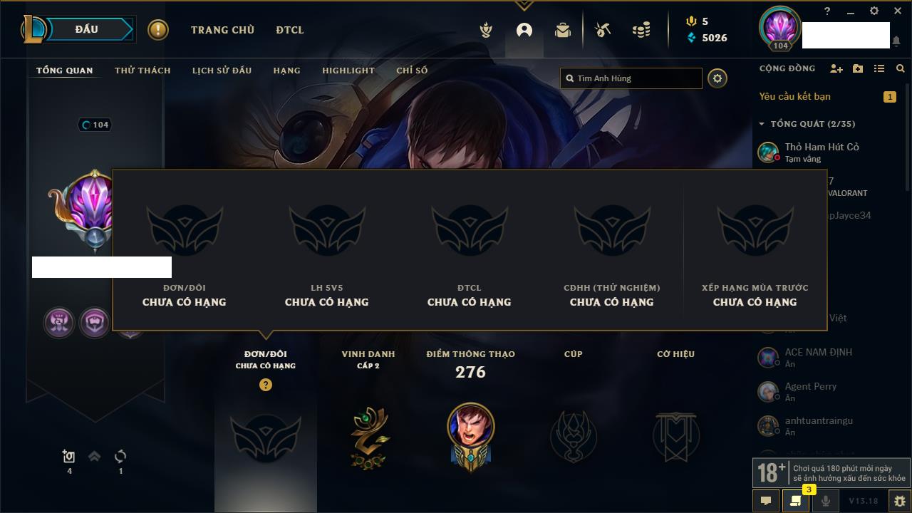 Rank Đơn: Chưa rank mùa nàoKhung: Chưa có khungTướng: 158 - Còn 6970 THXTrang Phục: 32Rank ĐTCL: Chưa RankLinh Thú: 24