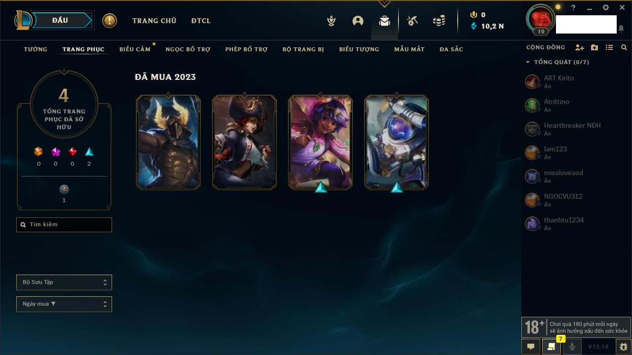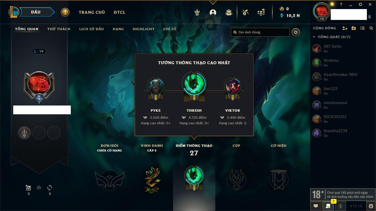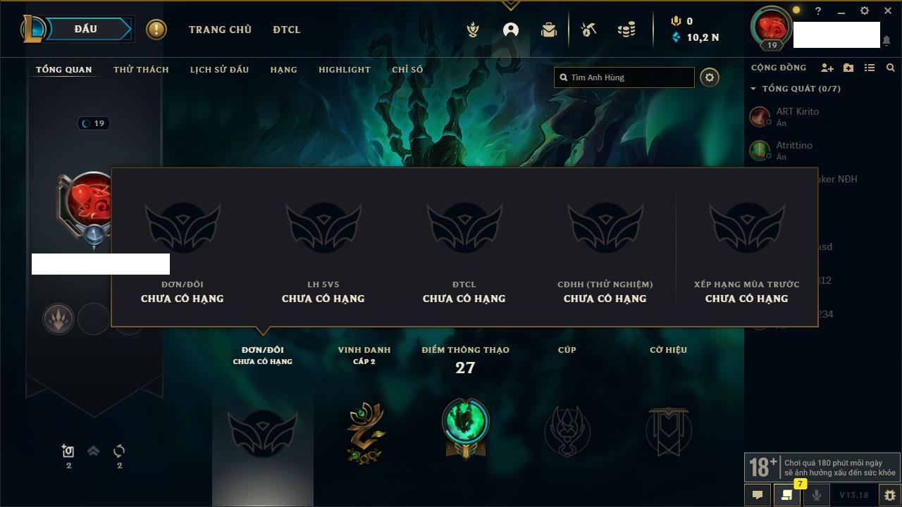 Rank Đơn: Chưa rank mùa nàoKhung: Chưa có khungTướng: 156 - Còn 18550 THXTrang Phục: 4Rank ĐTCL: Chưa RankLinh Thú: 75