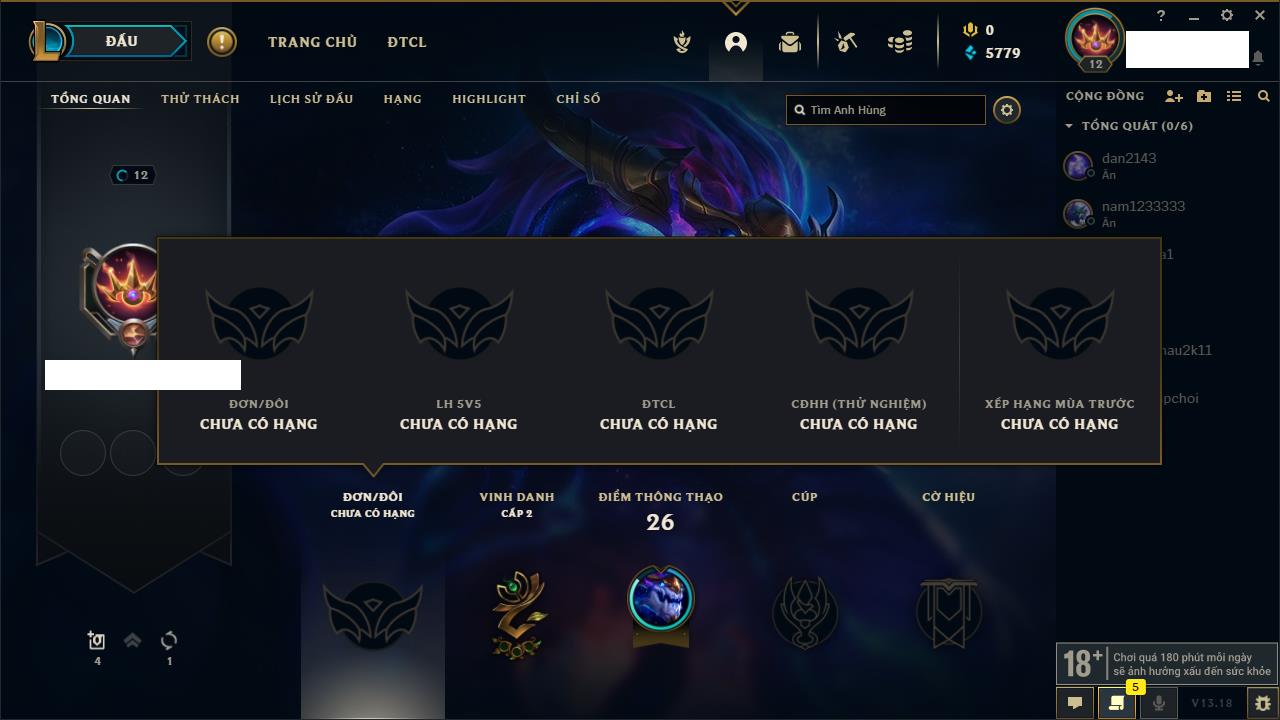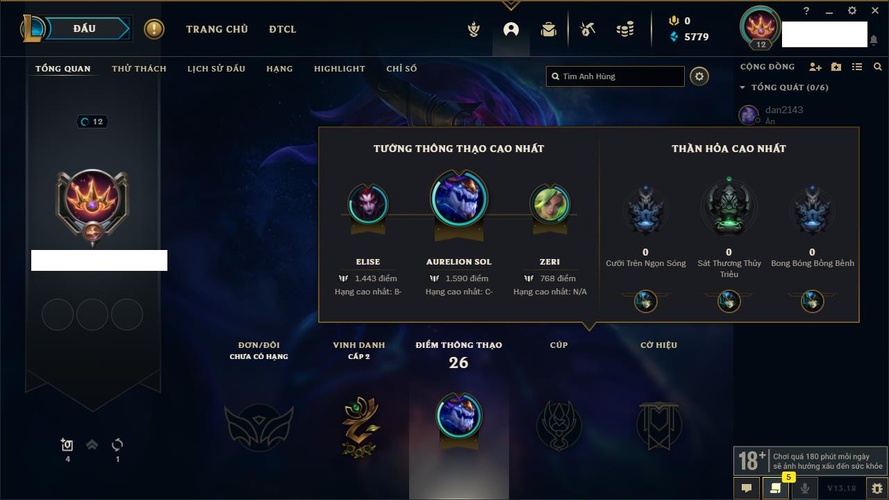 Rank Đơn: Chưa rank mùa nàoKhung: Chưa có khungTướng: 156 - Còn 18550 THXTrang Phục: 4Rank ĐTCL: Chưa RankLinh Thú: 75