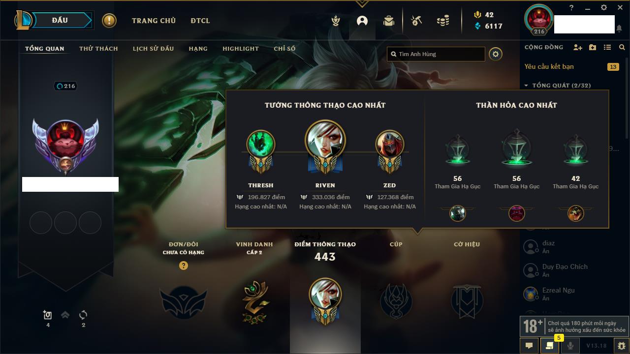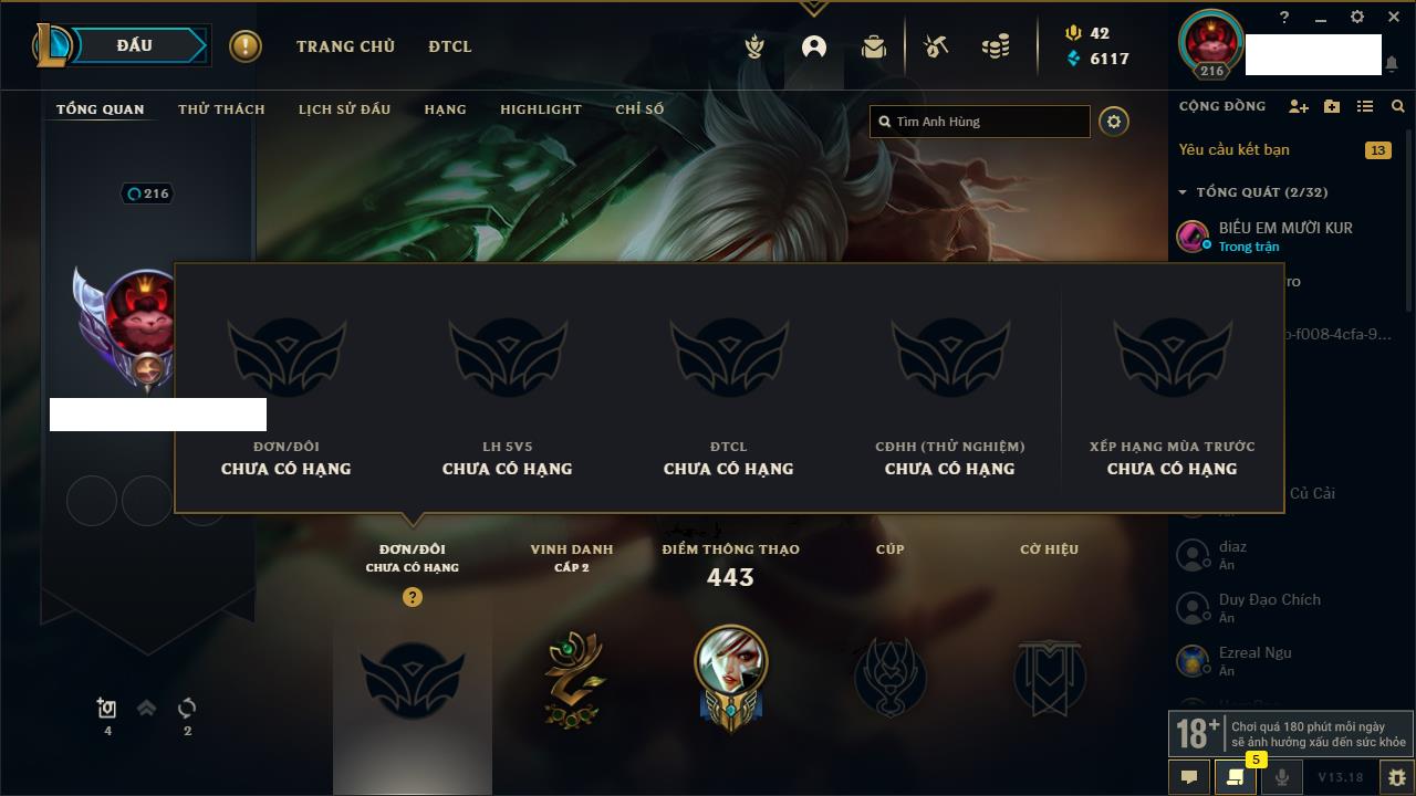 Rank Đơn: Chưa RankKhung: Chưa có khungTướng: 171 - Còn 827961 THXTrang Phục: 193Rank ĐTCL: Chưa RankLinh Thú: 63