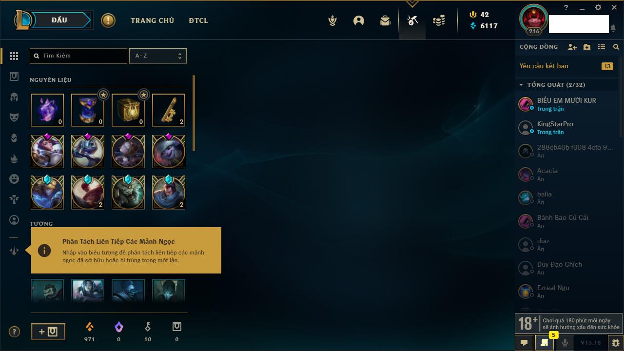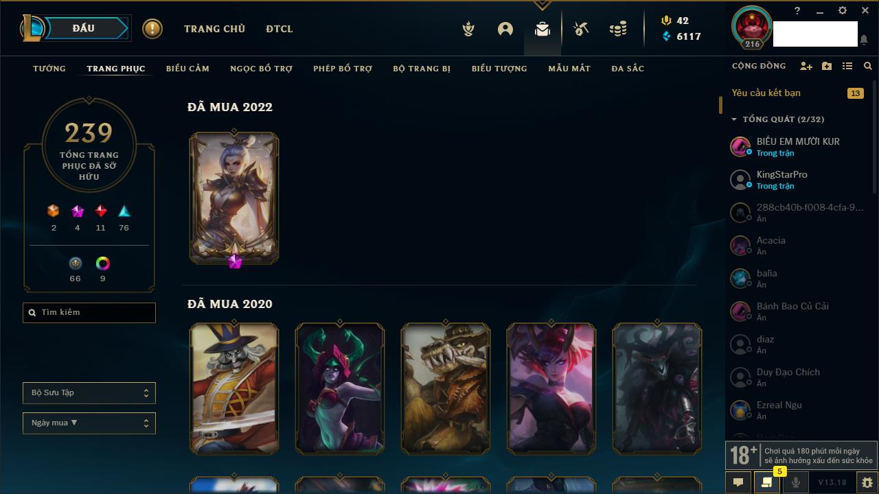 Rank Đơn: Chưa RankKhung: Chưa có khungTướng: 170 - Còn 42144 THXTrang Phục: 82Rank ĐTCL: Chưa RankLinh Thú: 130