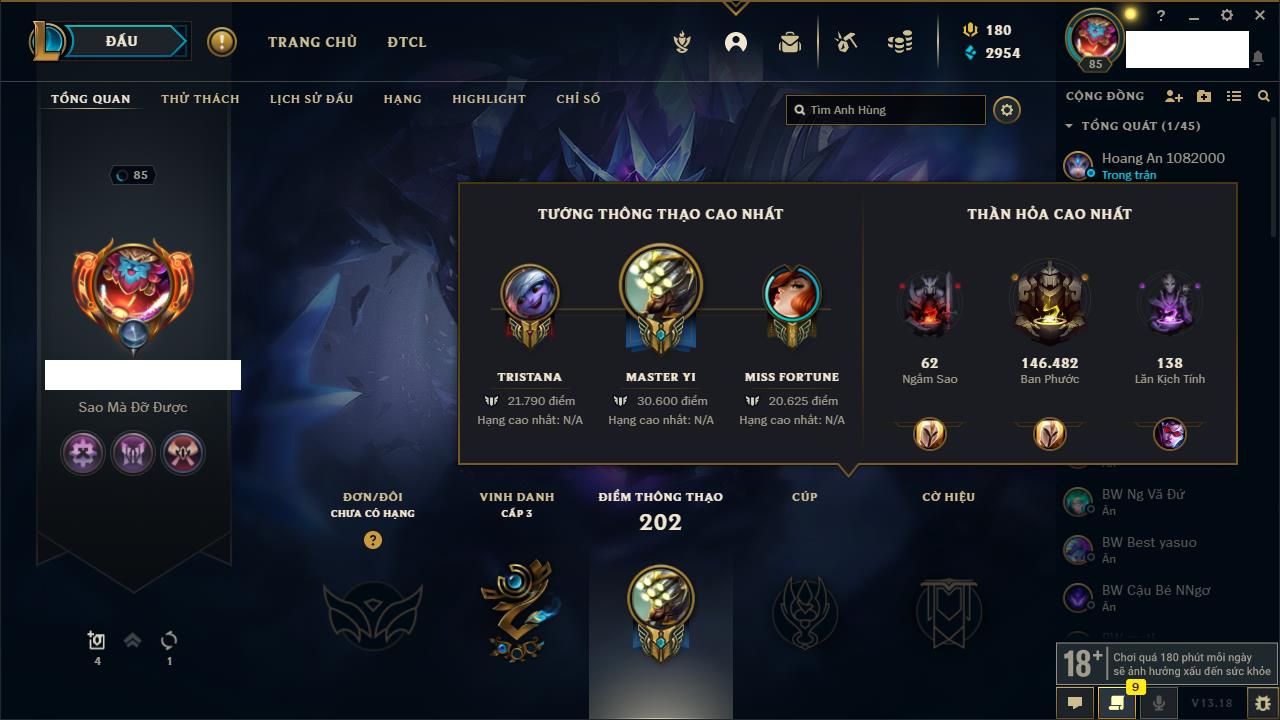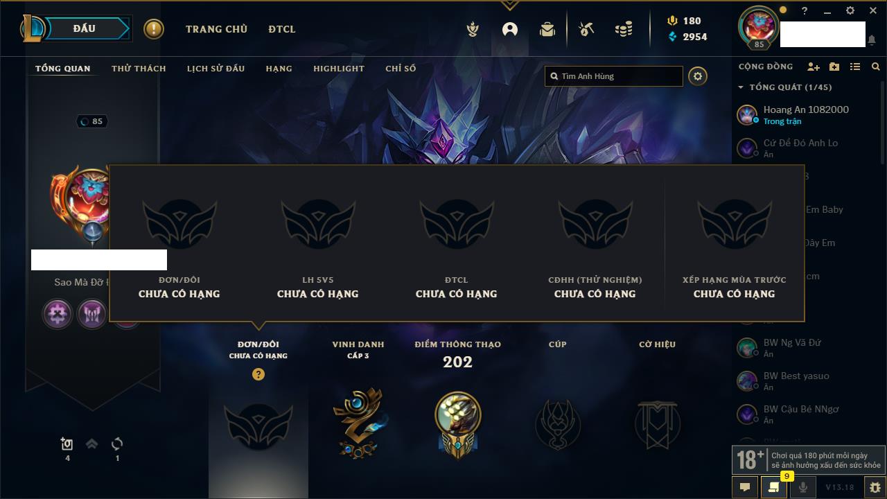 Rank Đơn: Chưa rank mùa nàoKhung: Chưa có khungTướng: 12 - Còn 3853 THXTrang Phục: 2Rank ĐTCL: Chưa RankLinh Thú: 30