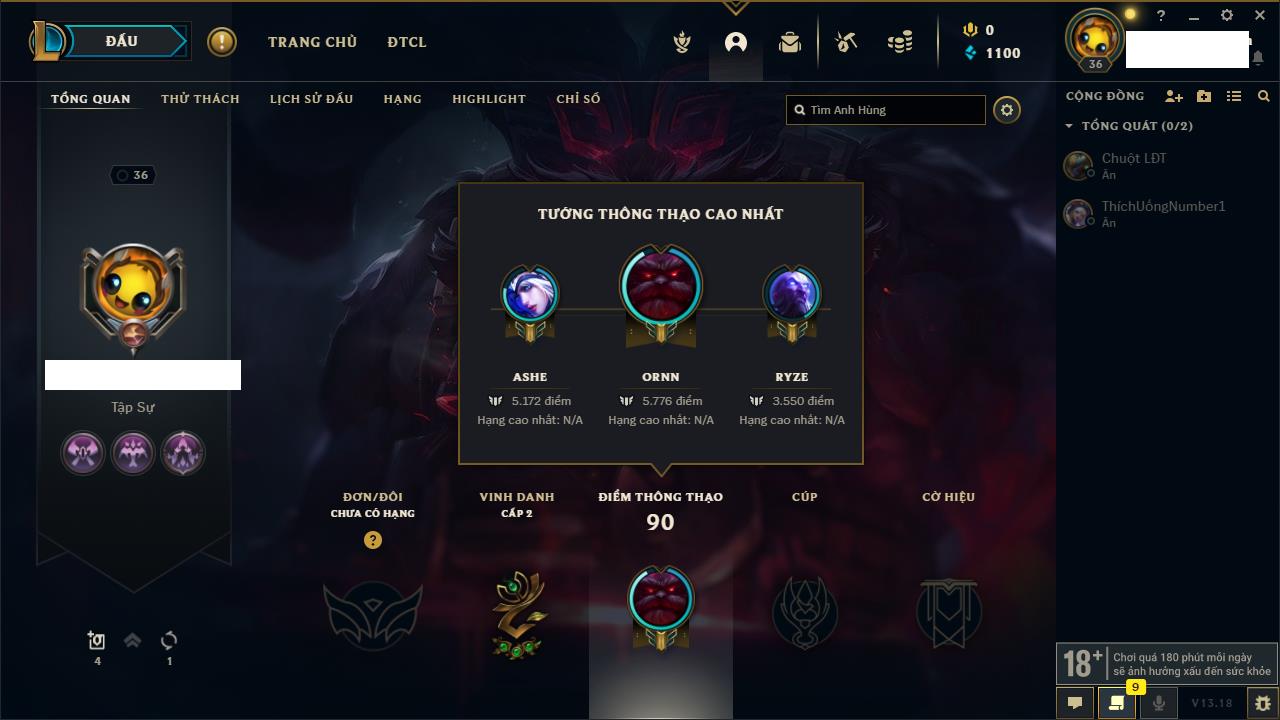 Rank Đơn: Chưa rank mùa nàoKhung: Chưa có khungTướng: 36 - Còn 190 THXTrang Phục: 14Rank ĐTCL: Chưa RankLinh Thú: 65