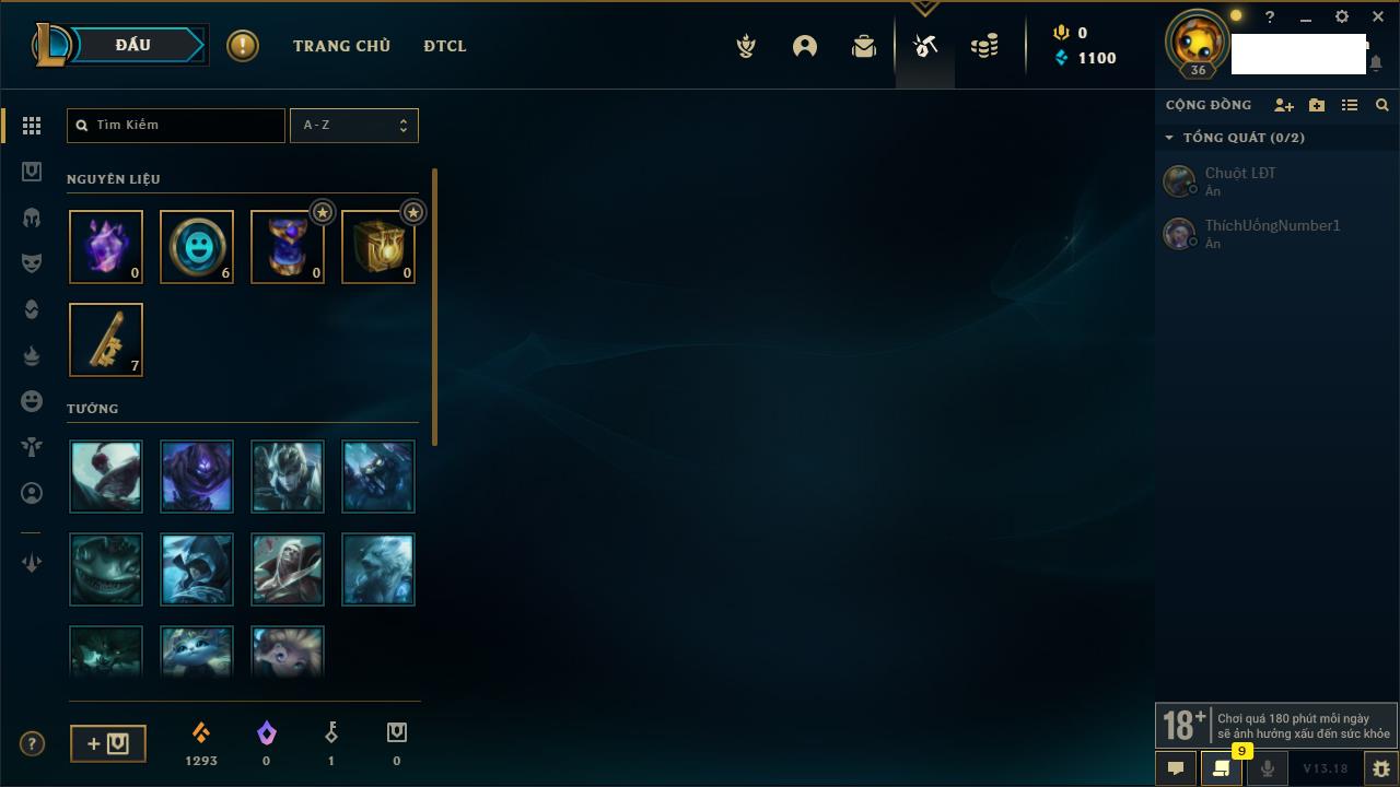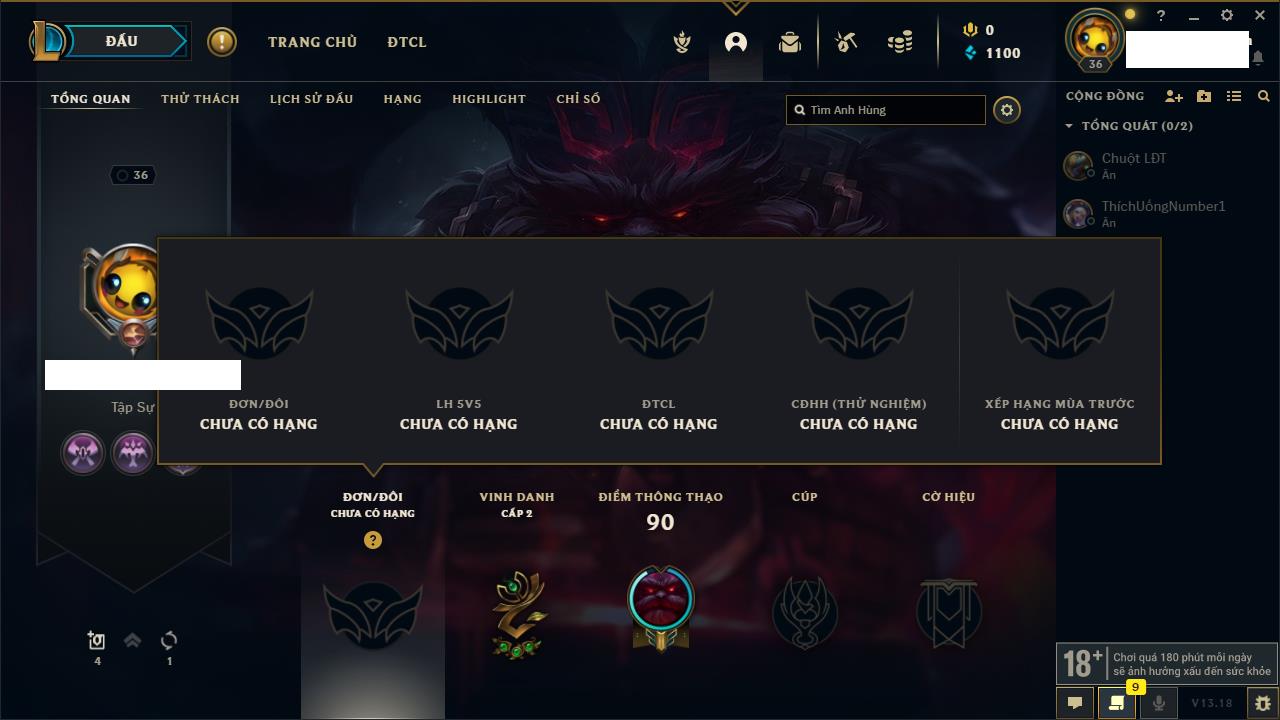 Rank Đơn: Chưa rank mùa nàoKhung: Chưa có khungTướng: 12 - Còn 3853 THXTrang Phục: 2Rank ĐTCL: Chưa RankLinh Thú: 30