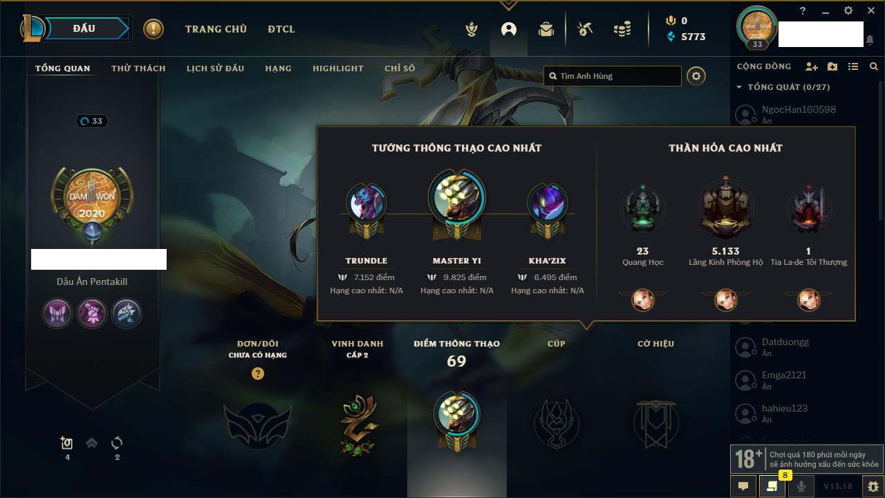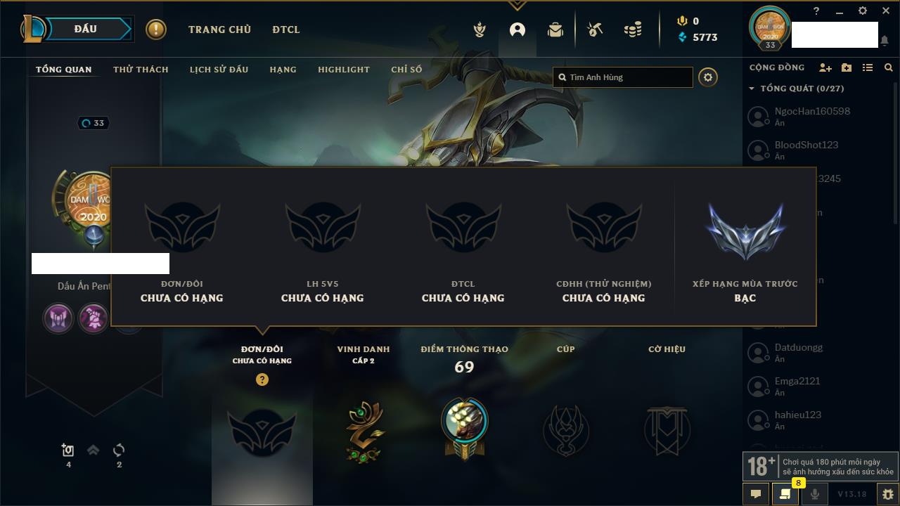 Rank Đơn: Chưa rank mùa nàoKhung: Chưa có khungTướng: 166 - Còn 9615 THXTrang Phục: 26Rank ĐTCL: Chưa RankLinh Thú: 27
