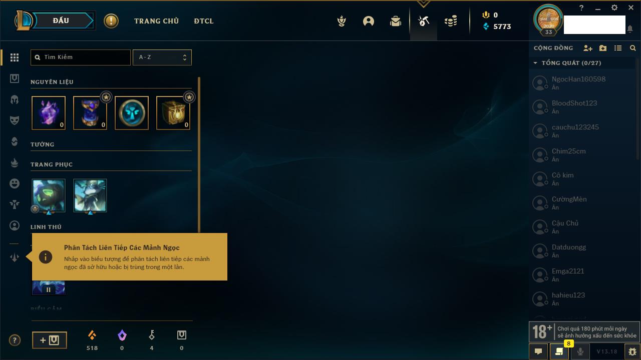 Rank Đơn: Chưa rank mùa nàoKhung: Chưa có khungTướng: 12 - Còn 3853 THXTrang Phục: 2Rank ĐTCL: Chưa RankLinh Thú: 30