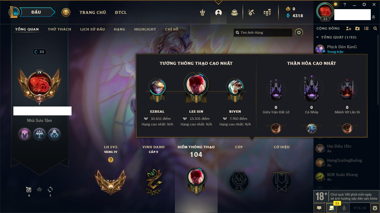 Rank Đơn: Chưa rank mùa nàoKhung: Chưa có khungTướng: 12 - Còn 3853 THXTrang Phục: 2Rank ĐTCL: Chưa RankLinh Thú: 30