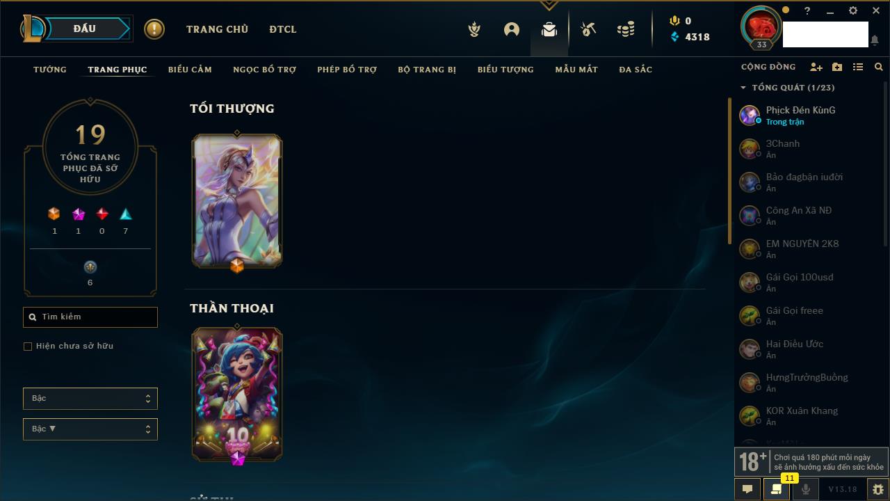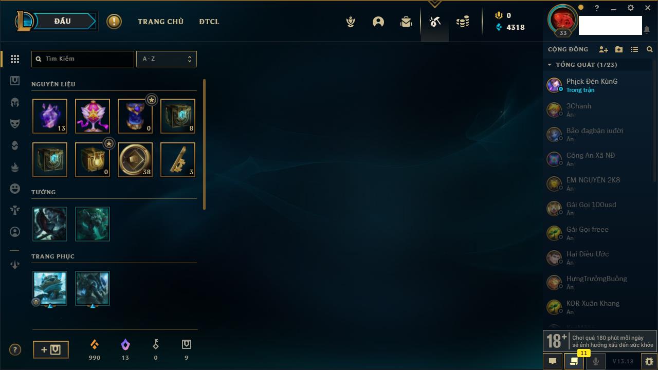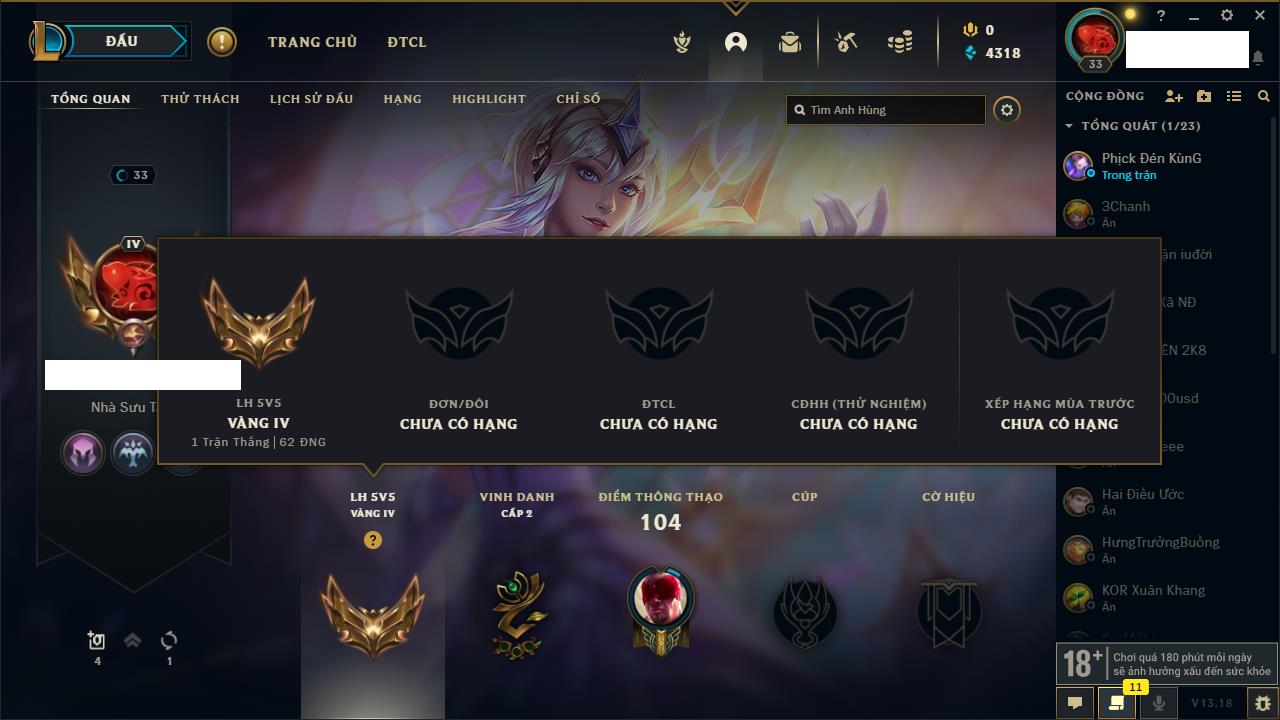 Rank Đơn: Chưa rank mùa nàoKhung: Chưa có khungTướng: 158 - Còn 6970 THXTrang Phục: 32Rank ĐTCL: Chưa RankLinh Thú: 24