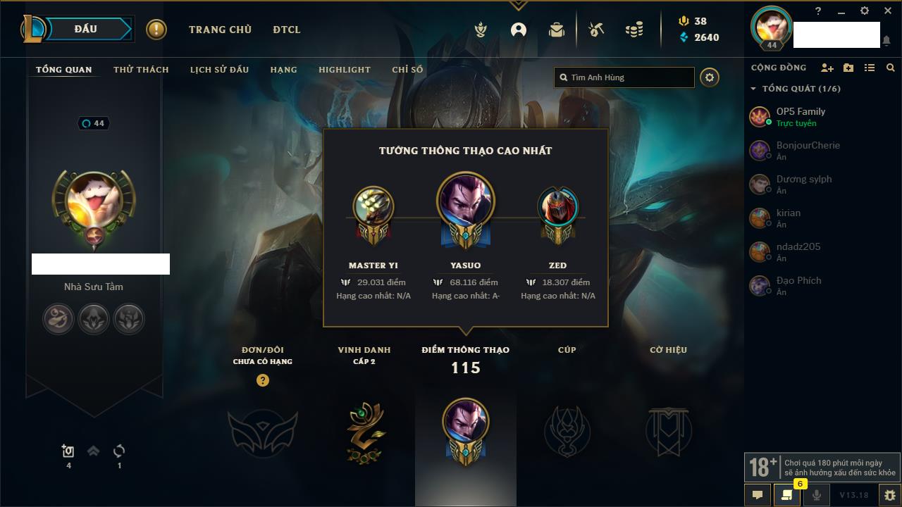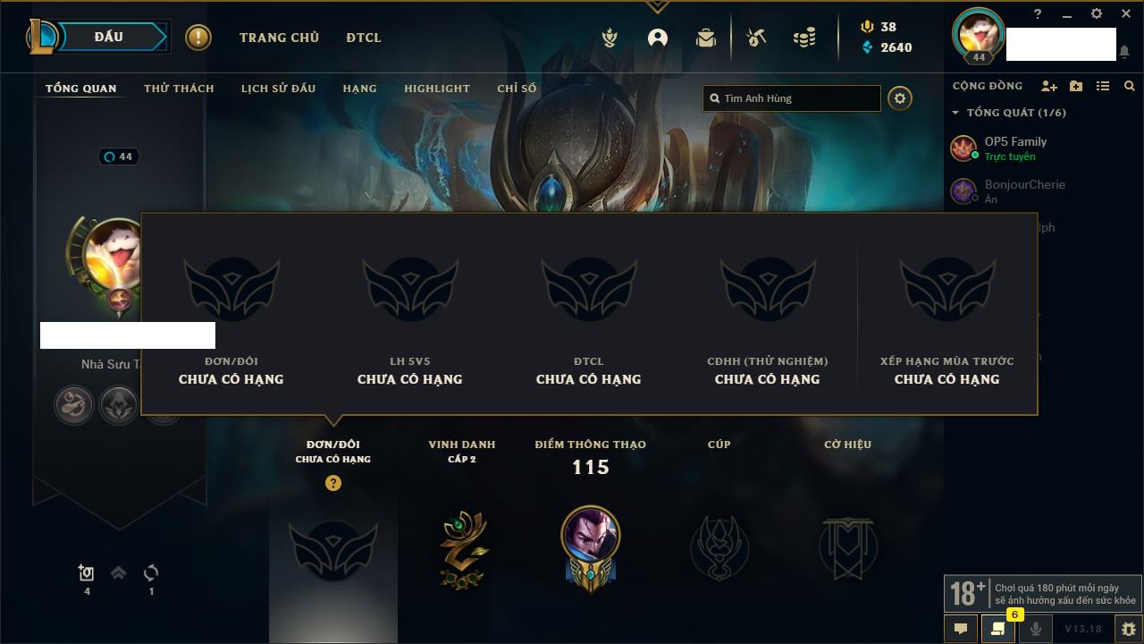 Rank Đơn: Chưa rank mùa nàoKhung: Chưa có khungTướng: 29 - Còn 2455 THXTrang Phục: 2Rank ĐTCL: Chưa RankLinh Thú: 14