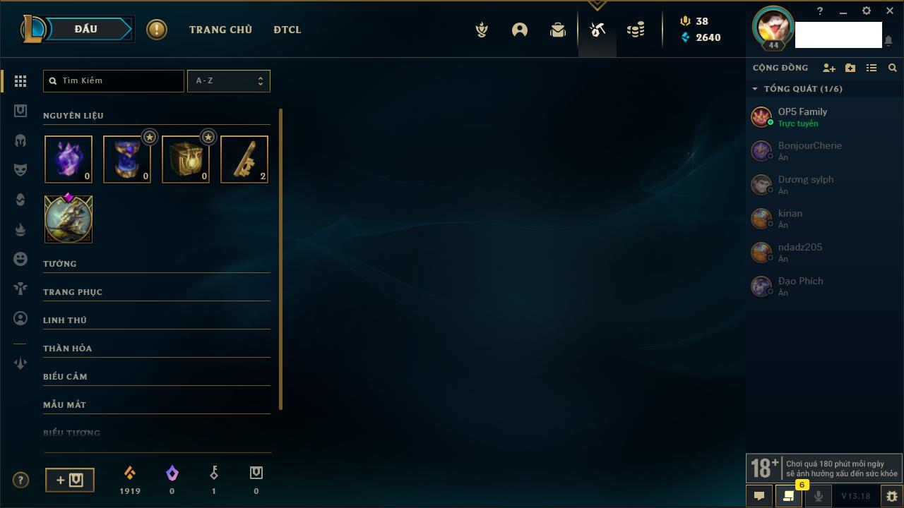 Rank Đơn: Chưa RankKhung: Chưa có khungTướng: 124 - Còn 2640 THXTrang Phục: 24Rank ĐTCL: Chưa RankLinh Thú: 19