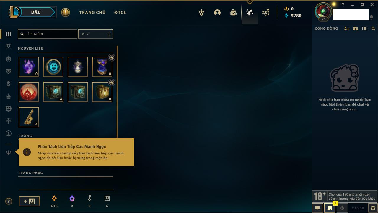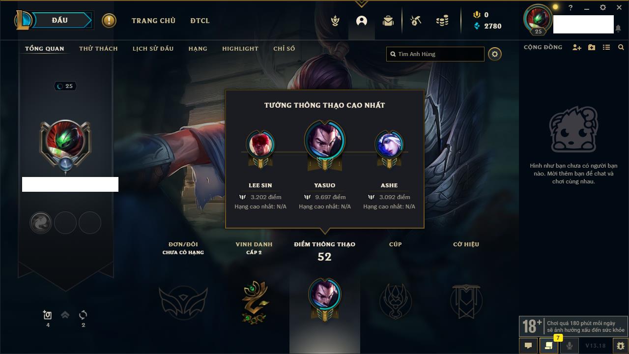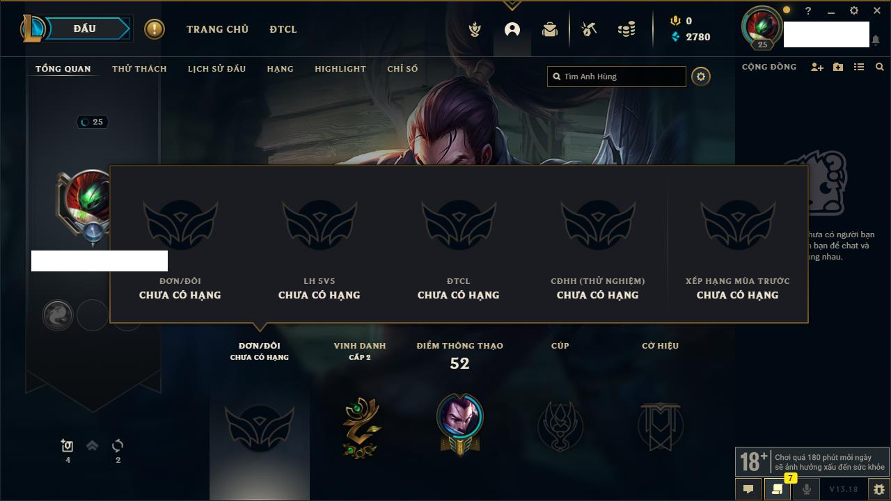 Rank Đơn: Chưa rank mùa nàoKhung: Chưa có khungTướng: 156 - Còn 18550 THXTrang Phục: 4Rank ĐTCL: Chưa RankLinh Thú: 75