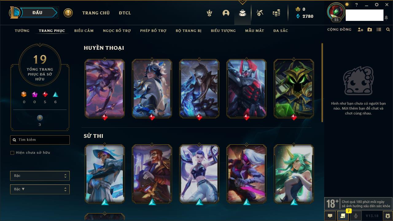 Rank Đơn: Chưa rank mùa nàoKhung: Chưa có khungTướng: 161 - Còn 11380 THXTrang Phục: 13Rank ĐTCL: Chưa RankLinh Thú: 74