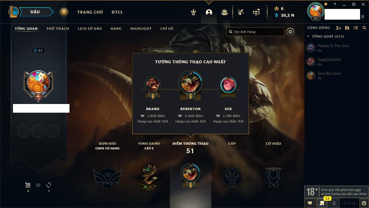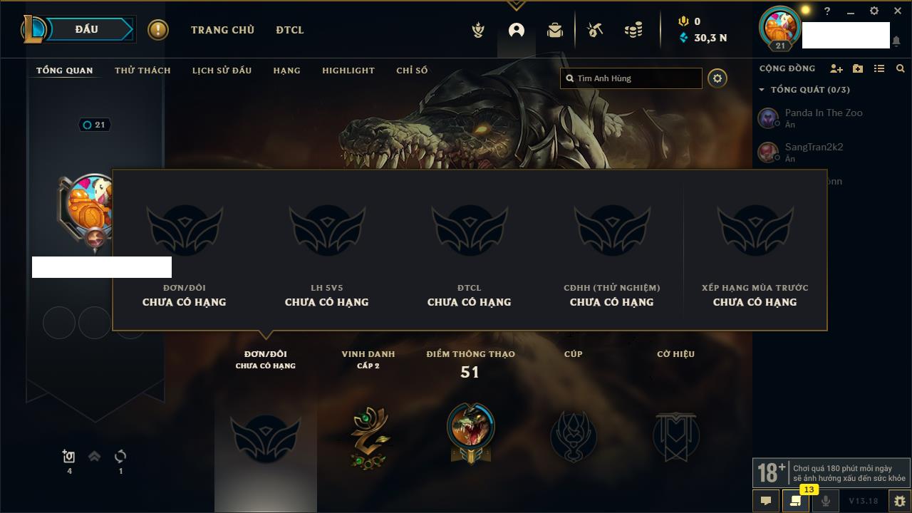 Rank Đơn: Chưa rank mùa nàoKhung: Chưa có khungTướng: 156 - Còn 18550 THXTrang Phục: 4Rank ĐTCL: Chưa RankLinh Thú: 75