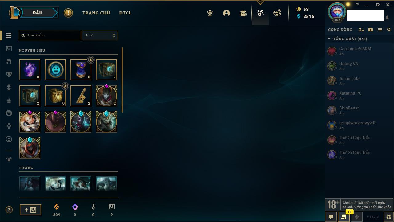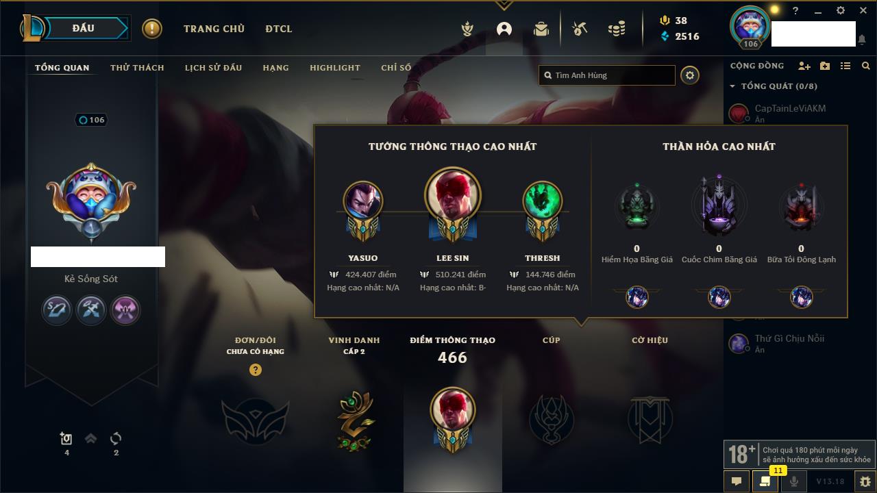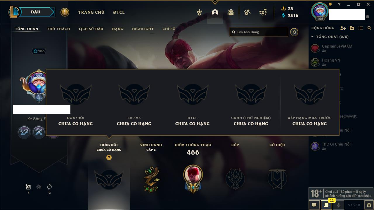Rank Đơn: Vàng IKhung: VàngTướng: 155 - Còn 18217 THXTrang Phục: 63Rank ĐTCL: Chưa RankLinh Thú: 49