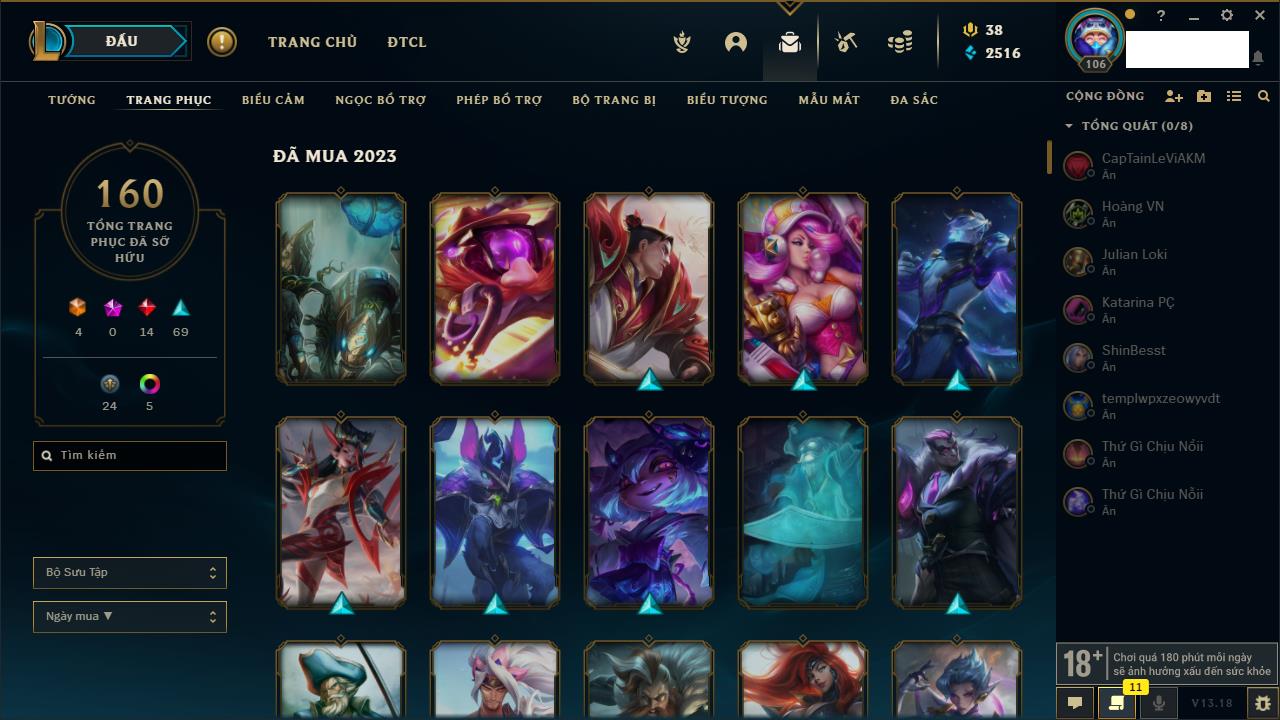 Rank Đơn: Chưa RankKhung: Chưa có khungTướng: 160 - Còn 2698 THXTrang Phục: 102Rank ĐTCL: Chưa RankLinh Thú: 101